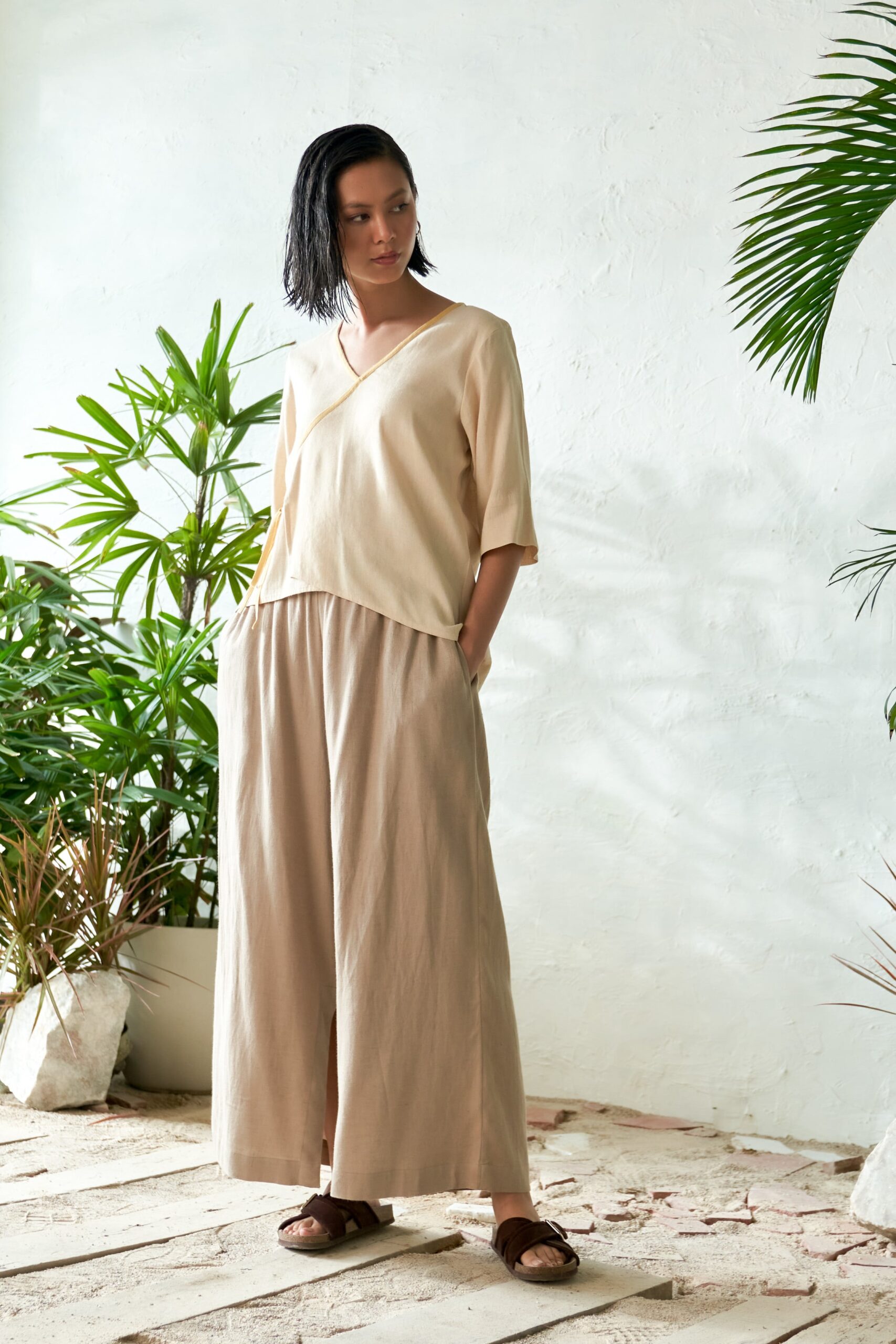 Elevate your summer style with the Beach Tan & Coffee Set. The Beach Tan Cross-Tie Top features a chic V-neckline, a stylish cross-section design, and an elegant side tie-up, crafted from breathable flex fabric for all-day comfort. Paired with the Breve Coffee Pant, designed with side slits, a flared casual fit, and an elasticated waistband, this set embodies effortless comfort and spontaneity, perfect for any warm-weather outing.