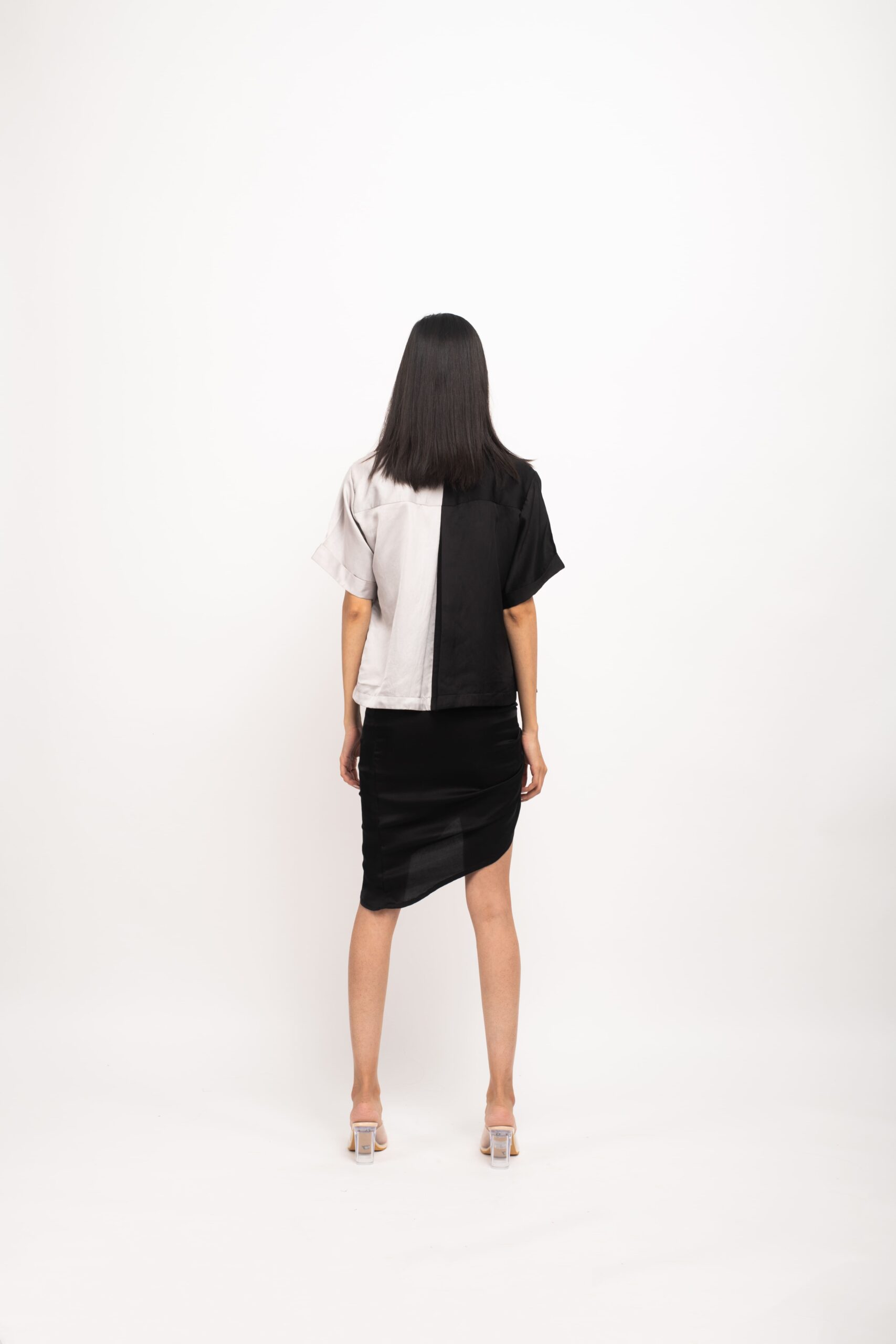 This elegant black-grey three-piece skirt set exudes sophistication and modern charm. It features a half-and-half crop shirt, where one side is black and the other grey, creating a striking visual contrast. The black bustier, detailed with grey piping throughout, adds a touch of refinement and structure to the ensemble. Completing the set is a black skirt with grey ruching on one side, enhancing its asymmetrical design and adding dynamic movement to the outfit. Ideal for upscale occasions and formal events, this ensemble promises to make a stylish statement with its chic design and impeccable detailing.
