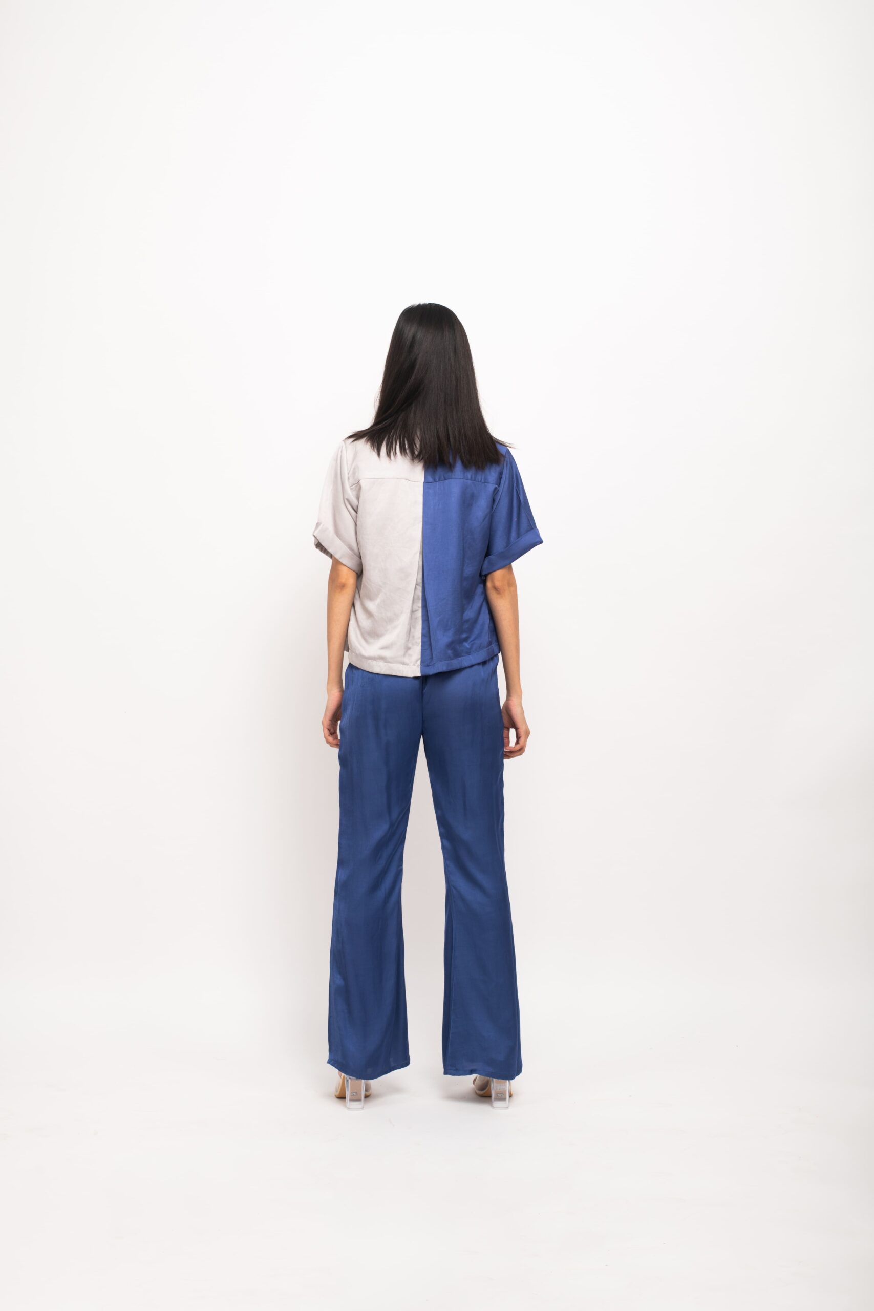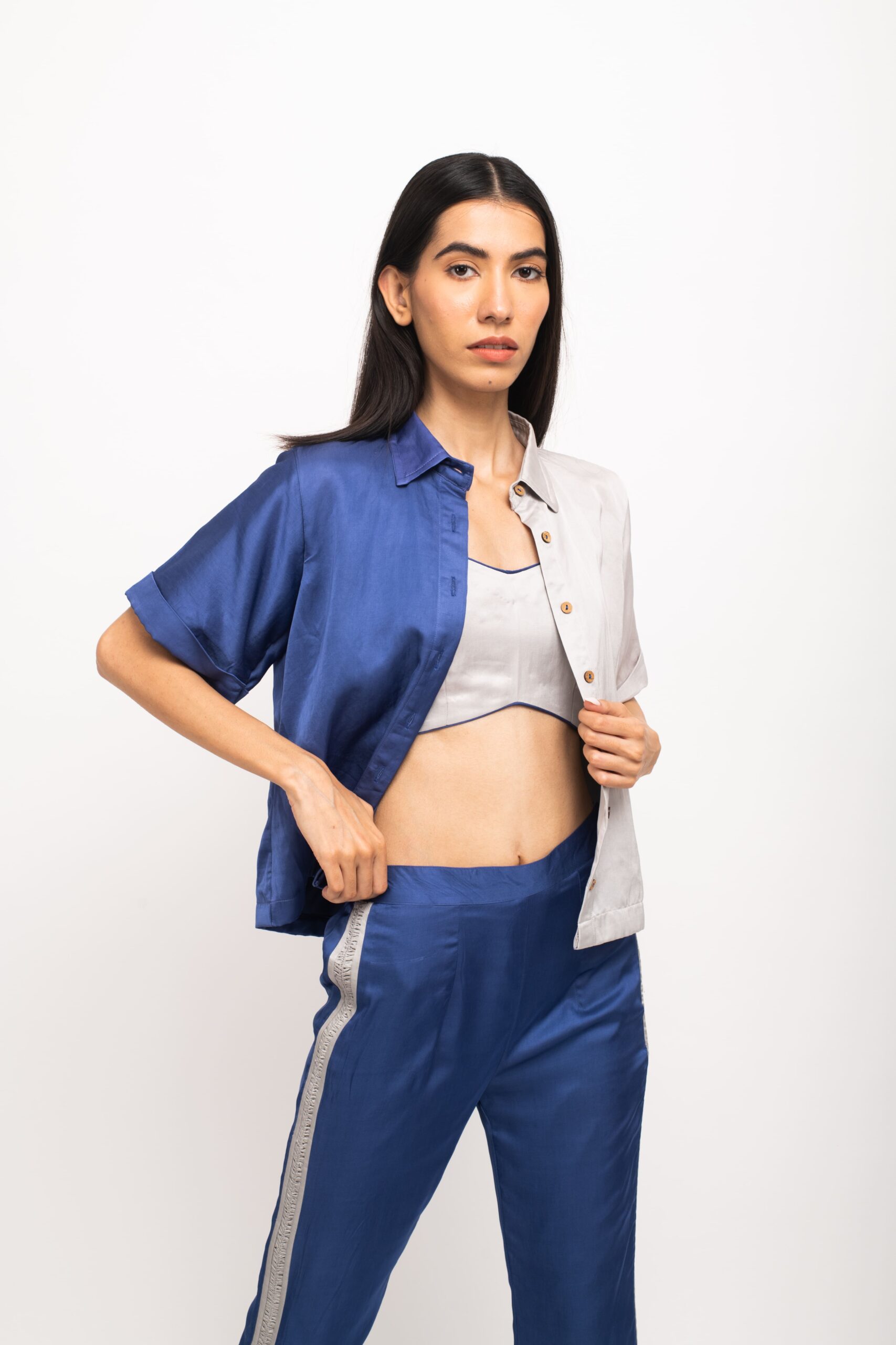 This chic three-piece set combines grey and blue tones effortlessly. It includes a half-and-half crop shirt with a stylish division between grey and blue, complemented by a structured grey bustier featuring elegant blue piping throughout. Completing the ensemble are straight blue pants with flattering grey ruching on each side, adding a touch of modern flair. Ideal for various occasions, this ensemble promises a polished and fashionable look with its sophisticated design and thoughtful detailing.