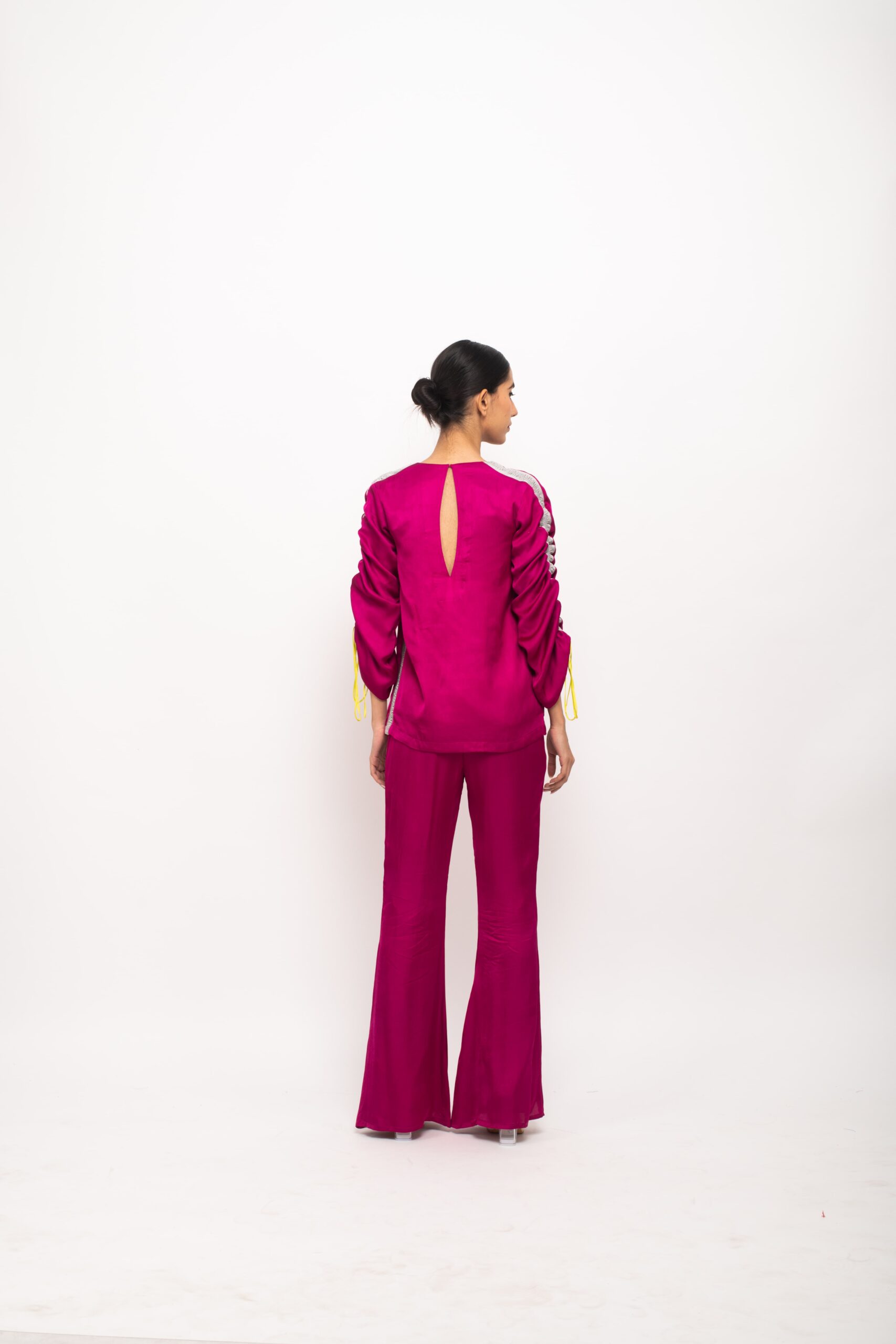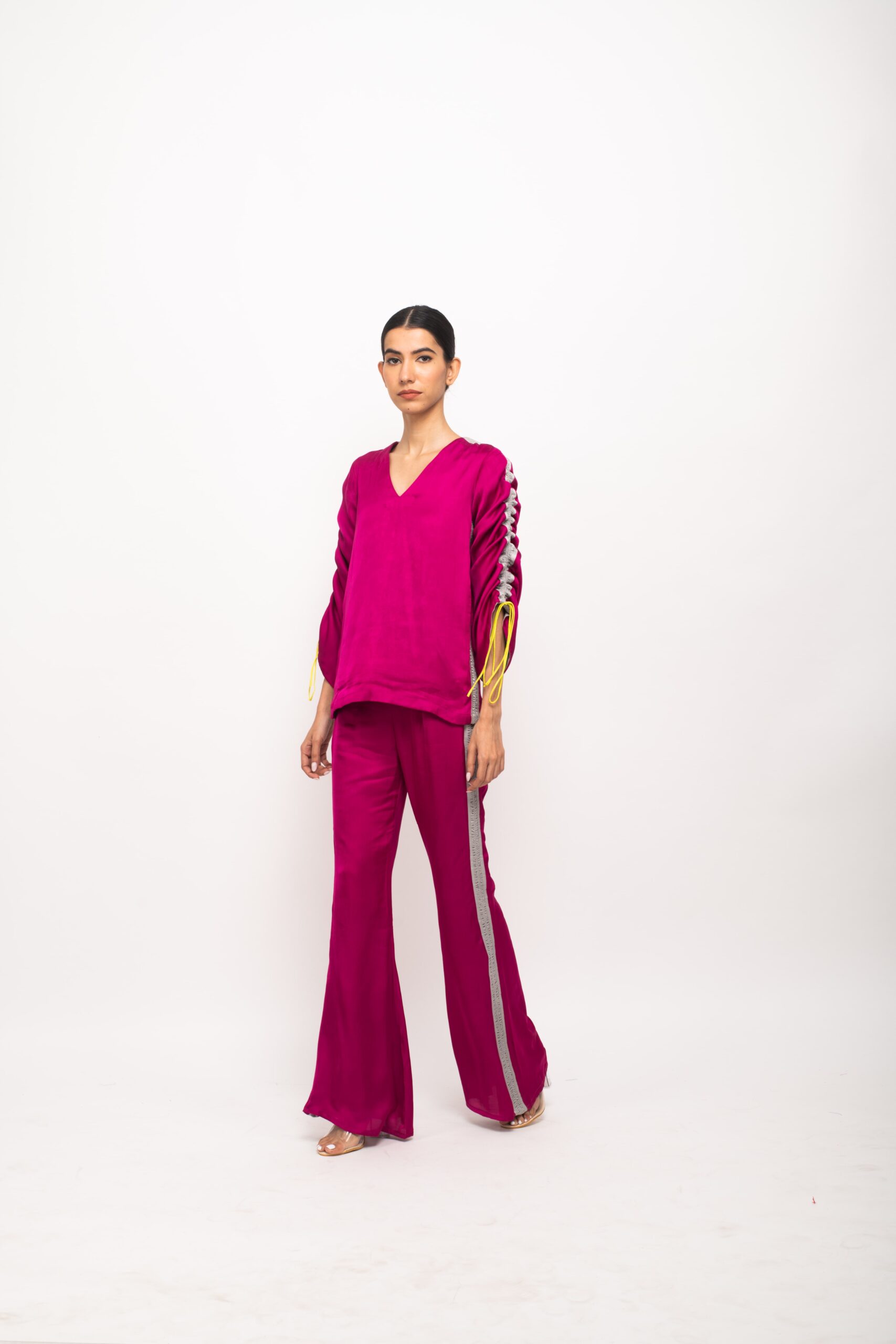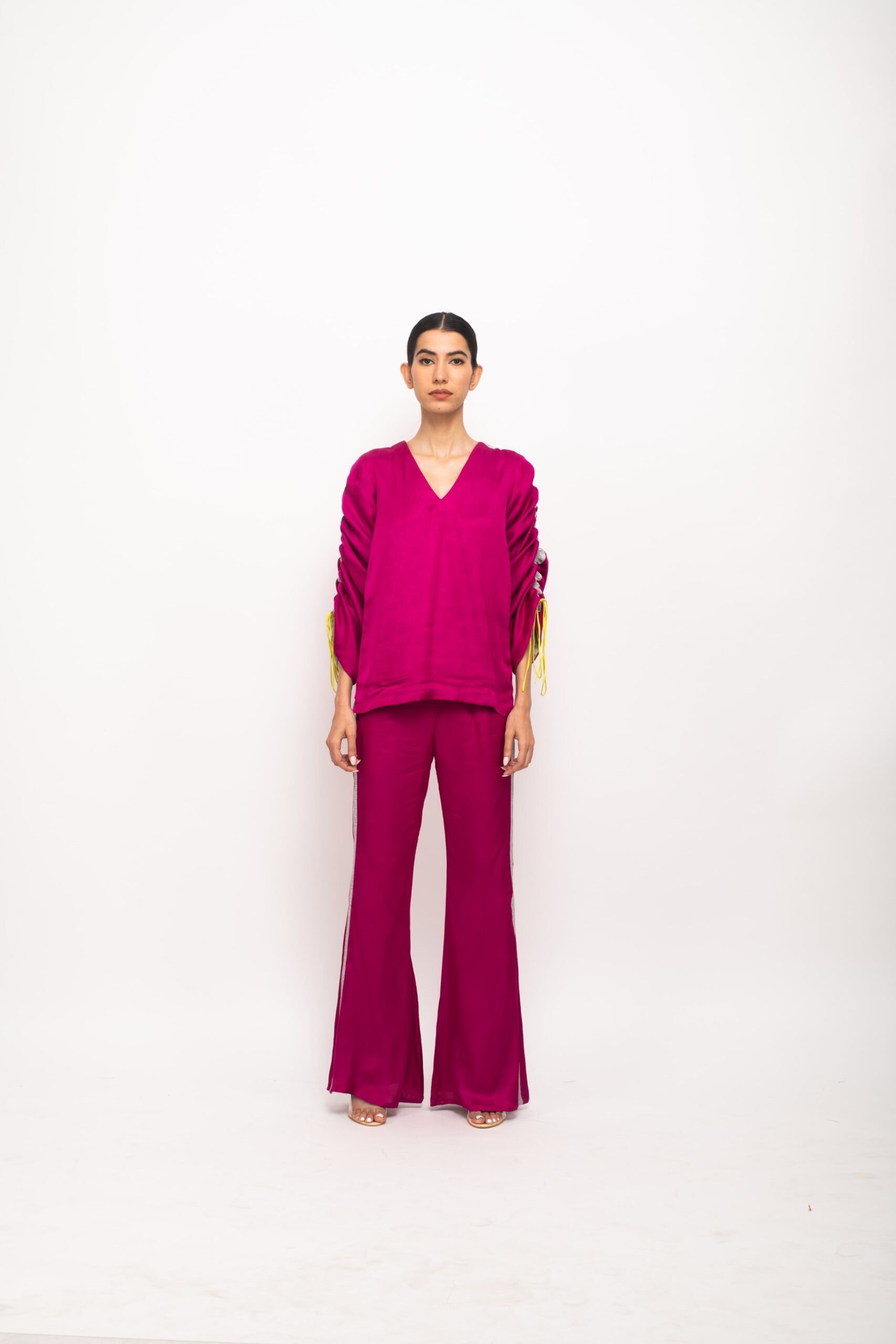 This stylish ensemble features a blue-grey full sleeves top designed with ruching on the sleeves, allowing for adjustable length and adding a touch of versatility. The ruching detail enhances the top’s aesthetic with its texture and modern appeal. Paired with straight blue pants that boast grey ruching on either side, the outfit offers a cohesive and sophisticated look. Perfect for both casual and semi-formal occasions, this ensemble promises comfort and style, making it a versatile addition to any wardrobe seeking contemporary elegance and practicality.