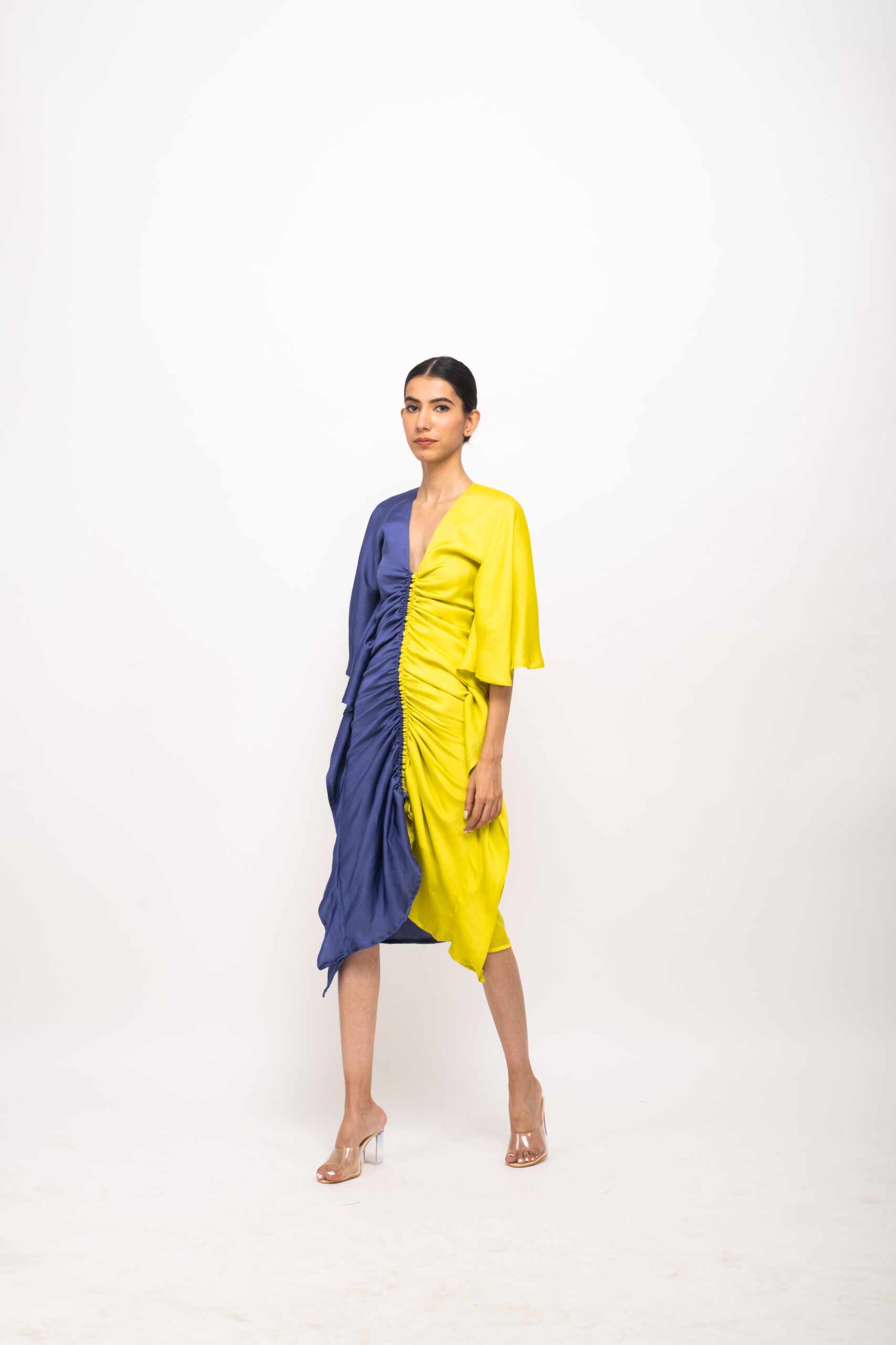 Presenting a vibrant blue-neon body-fitted kaftan dress, enhanced with adjustable ruching in the front, allowing for a customizable length to suit personal preference. This dress combines boldness with versatility, perfect for making a stylish statement at any event. Ideal for those who value both comfort and chic style, this piece ensures a flattering and personalized fit for every occasion.