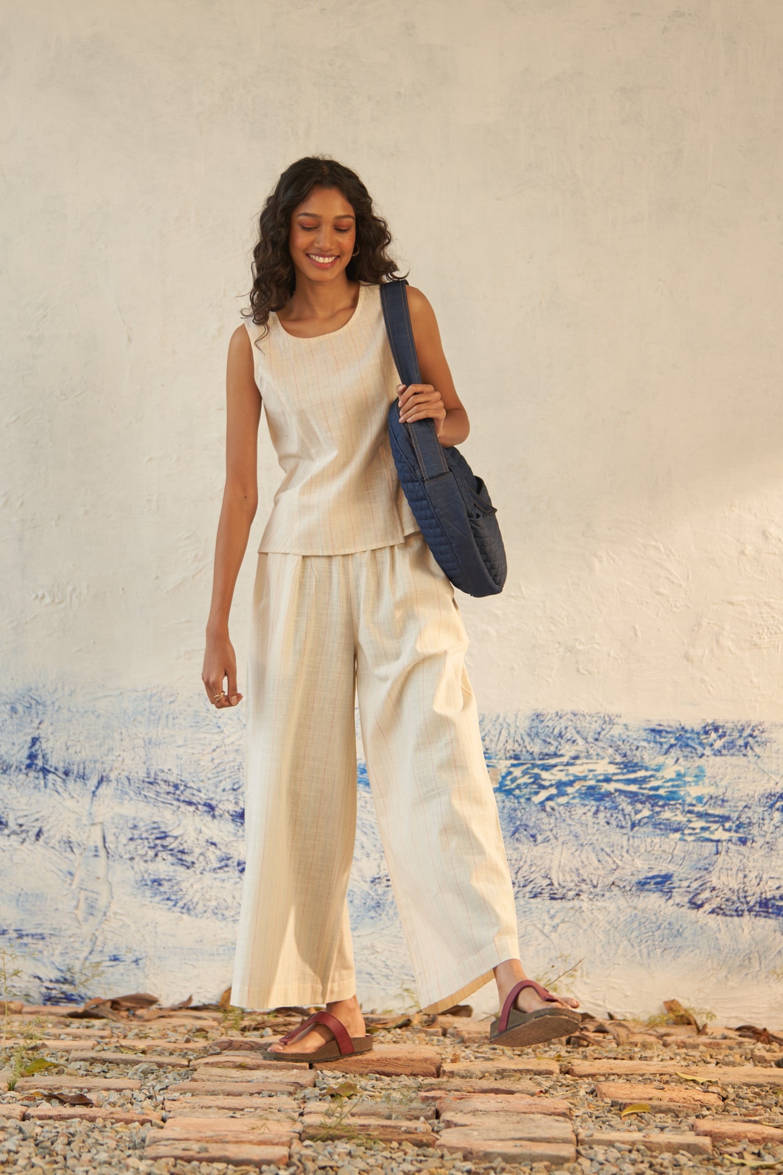 Take the road in our sleeveless textured cotton top adorned with colorful lines throughout. Featuring a round neckline and a delicate front slit, it exudes understated refinement. Complement the ensemble by teaming it with our coordinating wide-legged pants for a uber cool ease look.
