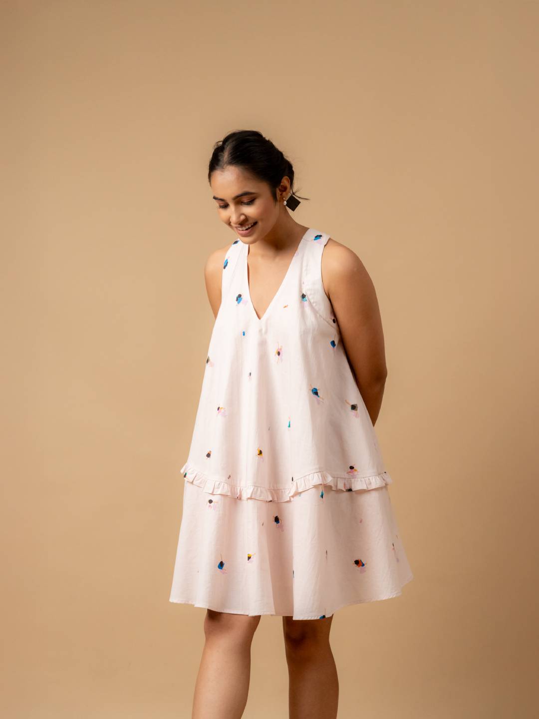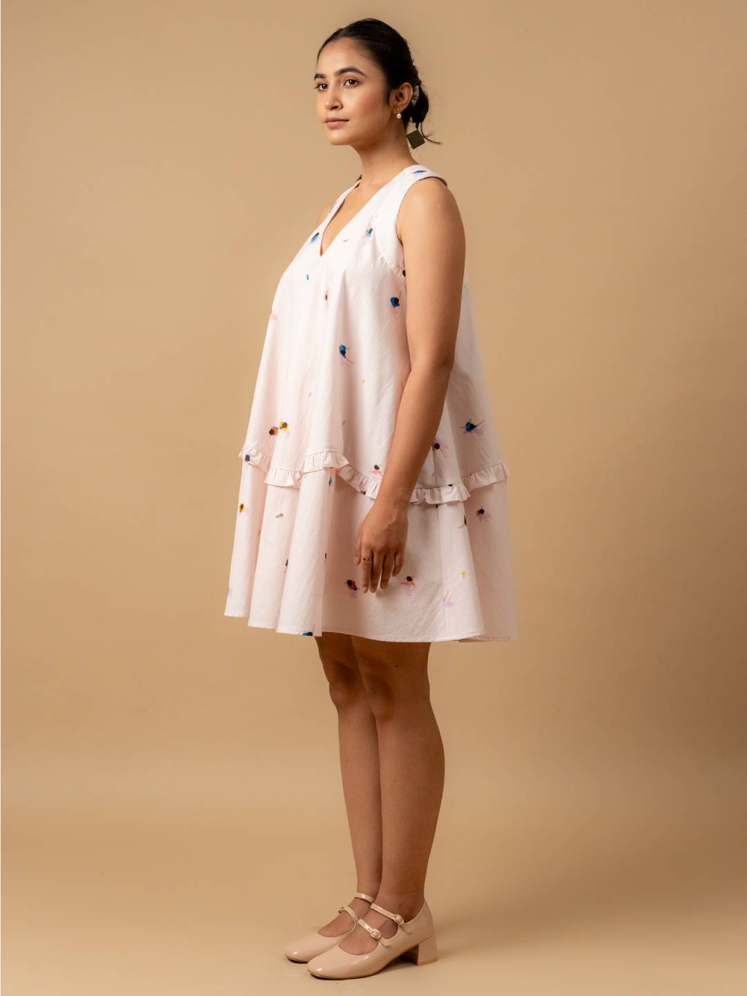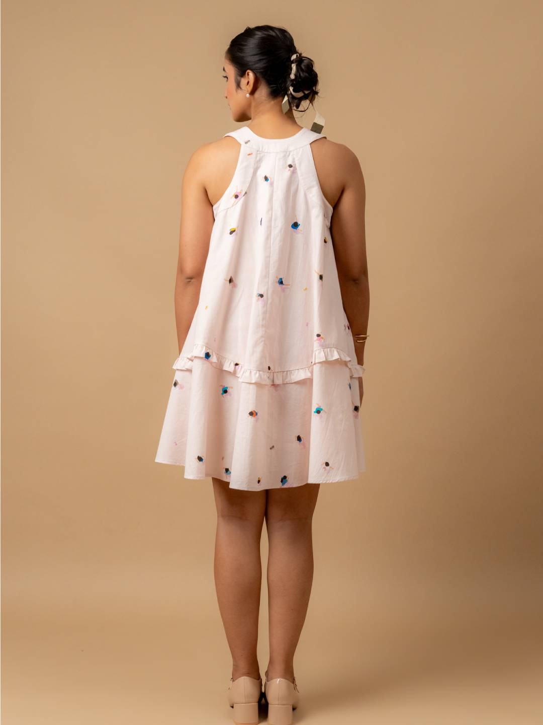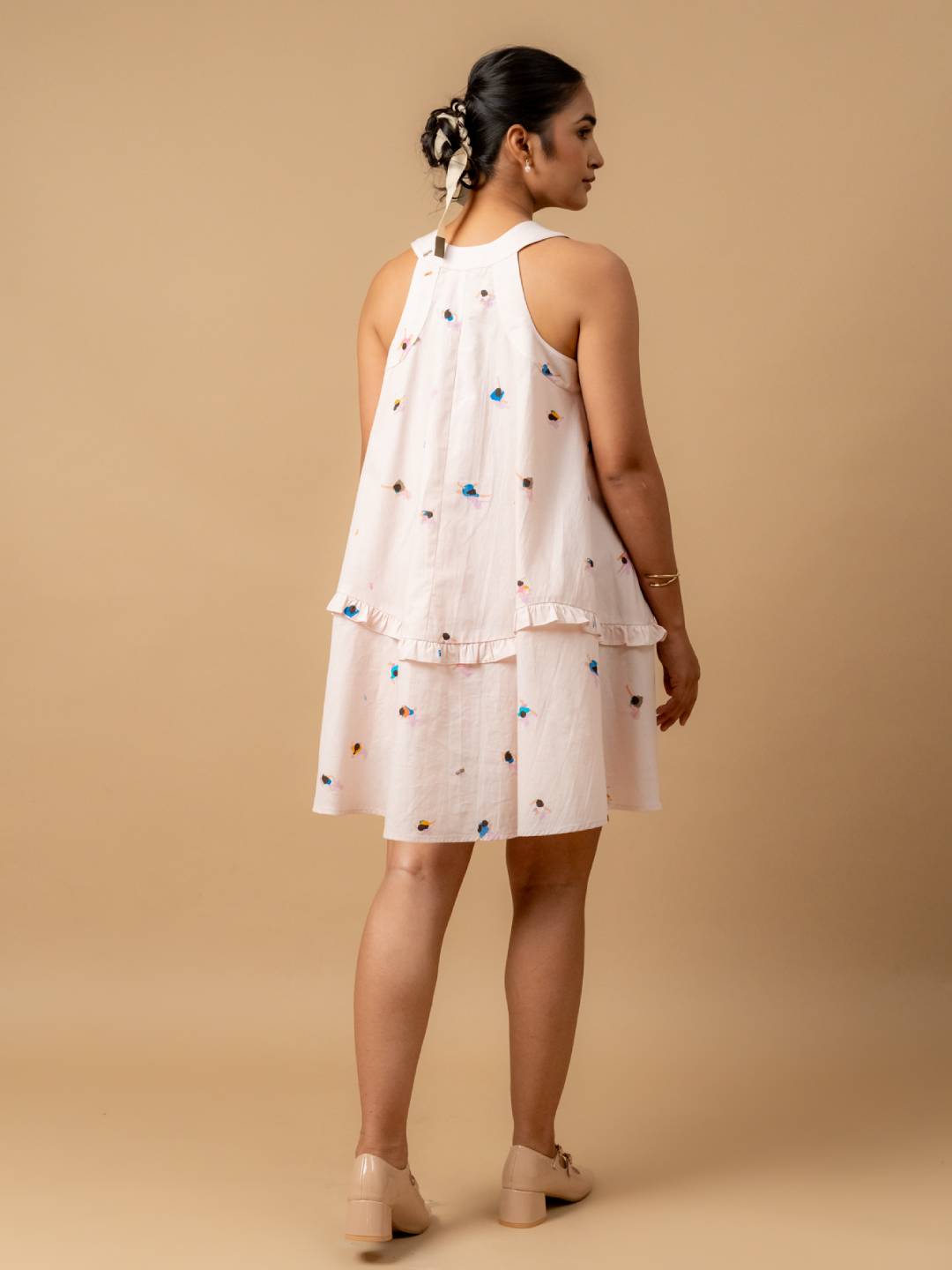 Exaggerated A-line short dress with frill, racer back dress comes with side pockets.