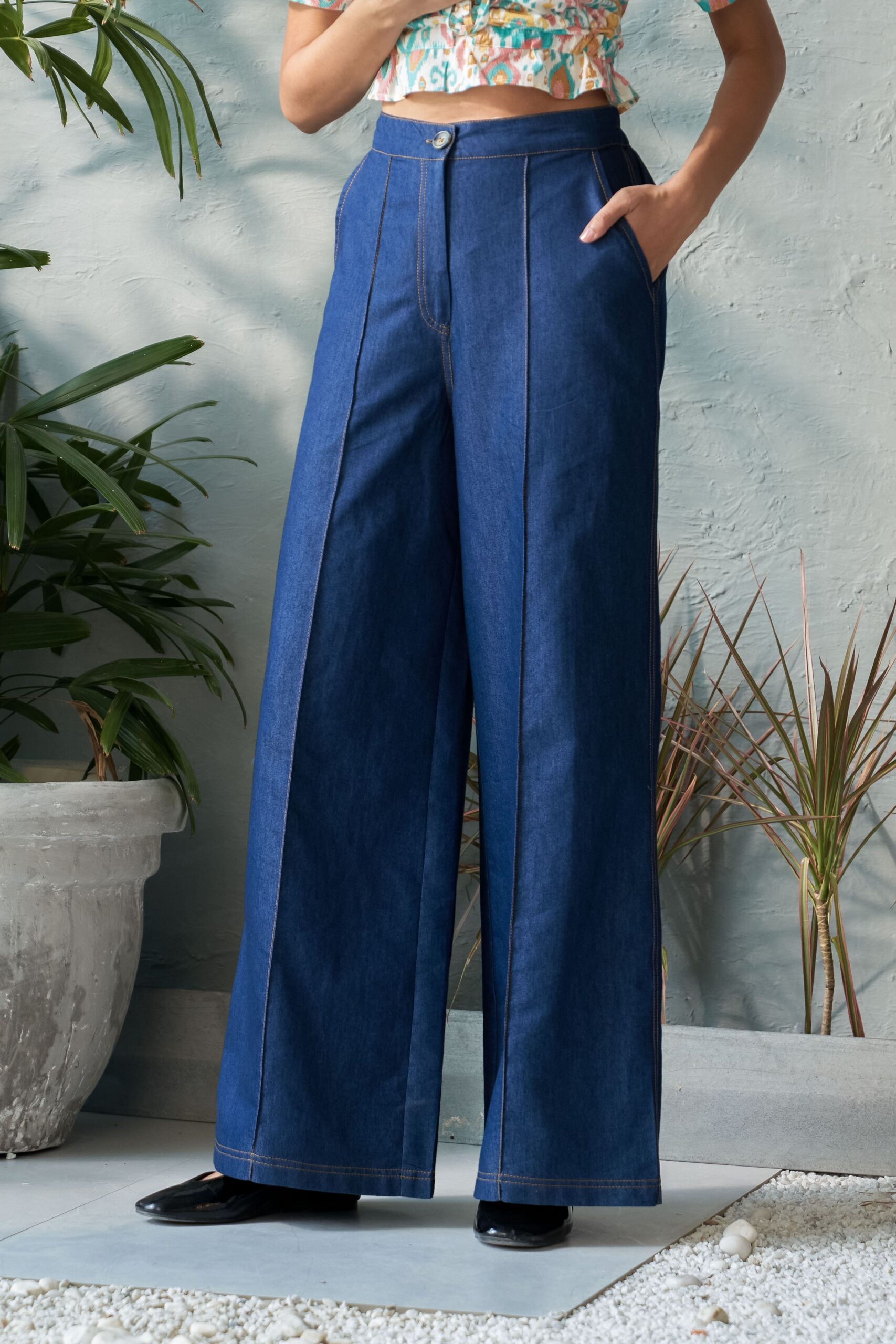 Fitted flared Denims with front stitch detailing combines a sleek, form-fitting design with stylish flare at the bottom. The front stitch detail adds a polished, tailored look, making these jeans both trendy and flattering. The flared cut helps elongate the legs, while the front stitching enhances the overall silhouette, perfect for a chic and sophisticated outfit.