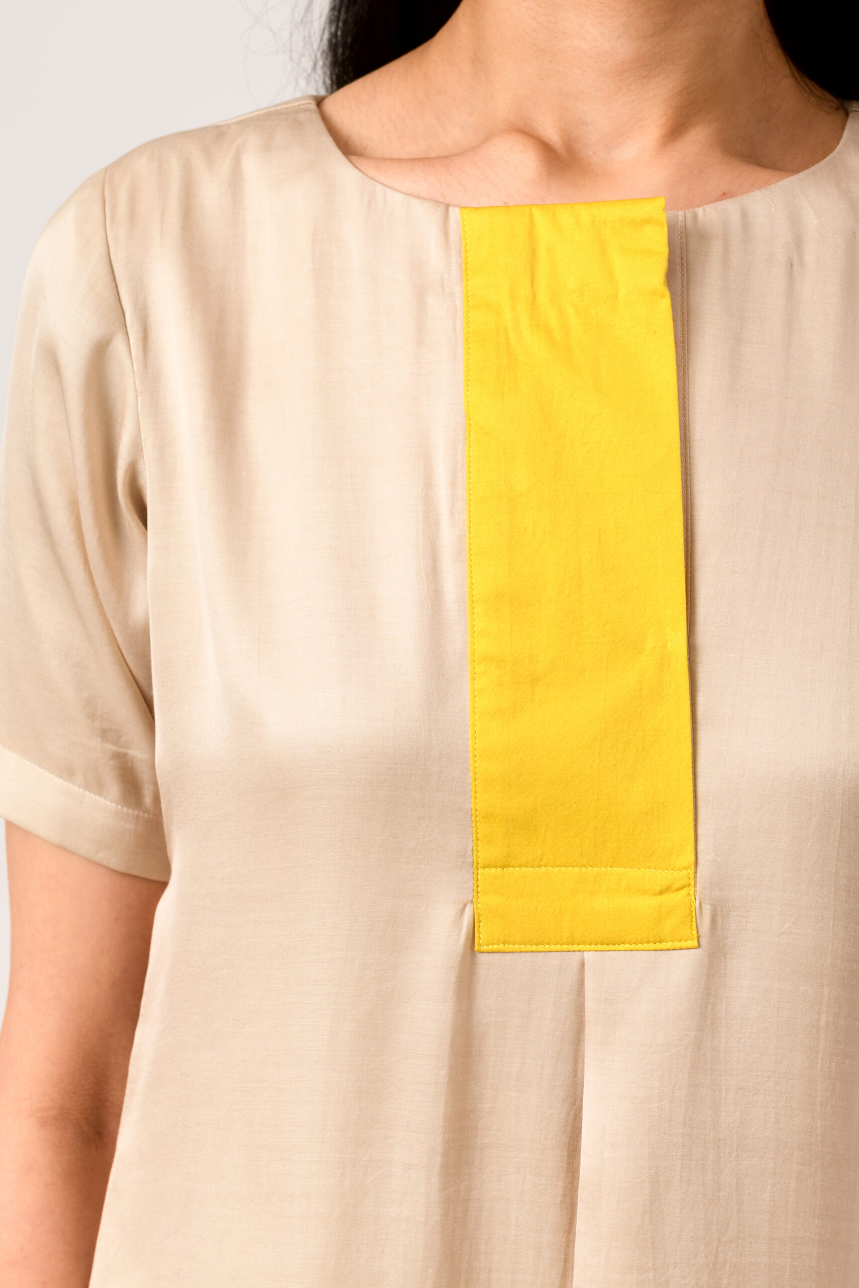 This Ecru-Yellow blouse exudes contemporary elegance with its striking yellow color-blocked paneling and chic half sleeves. The ecru base adds a touch of sophistication, making it versatile for both casual and semi-formal settings. Ideal for adding a vibrant pop of color to any wardrobe ensemble.