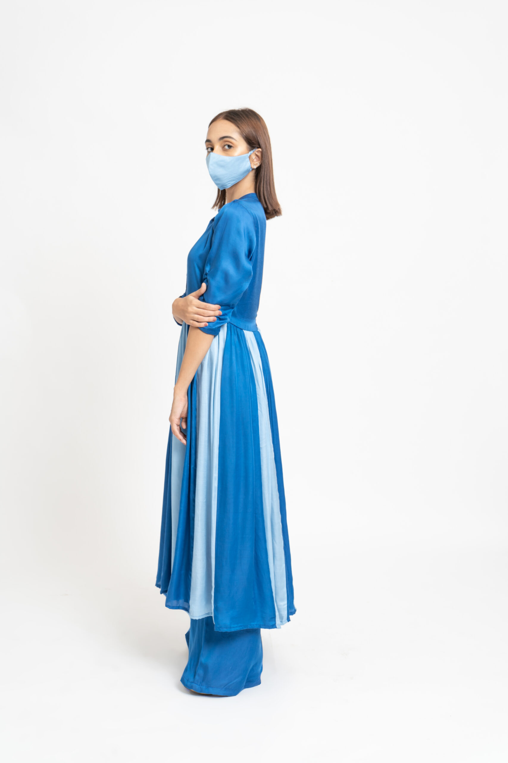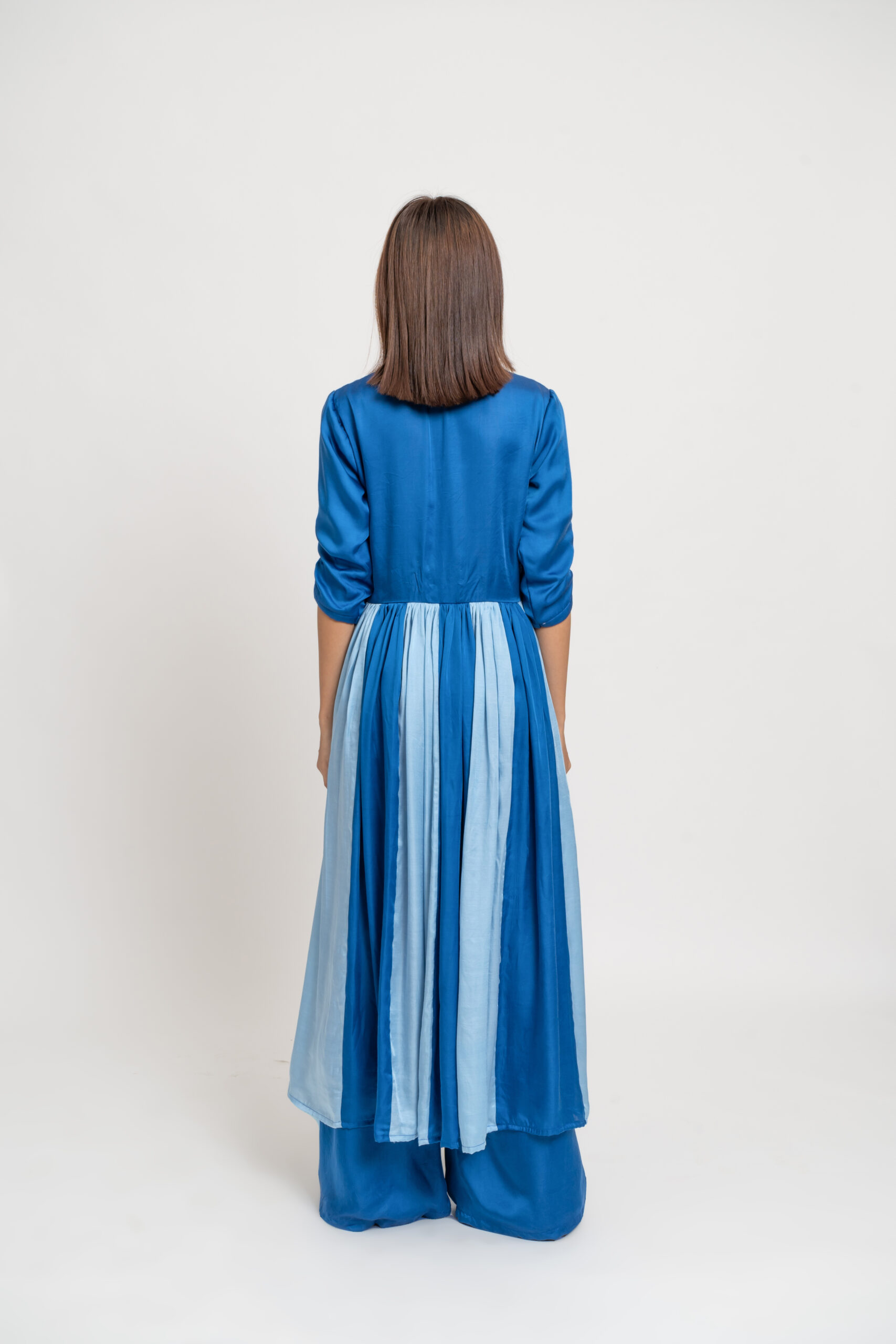 The Electric Blue and Ice Blue Colorblocked Panelled Kurta exudes contemporary elegance with its vibrant color contrast and patterned detailing on the elbow sleeves. Paired impeccably with wide-legged Electric Blue Pants, this ensemble combines modern sophistication with cultural flair, making it ideal for both formal events and casual gatherings.