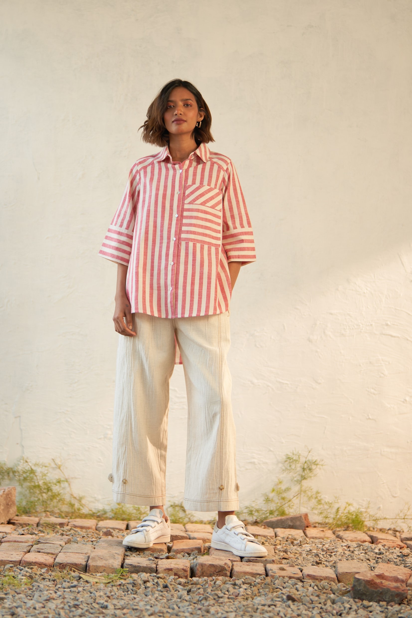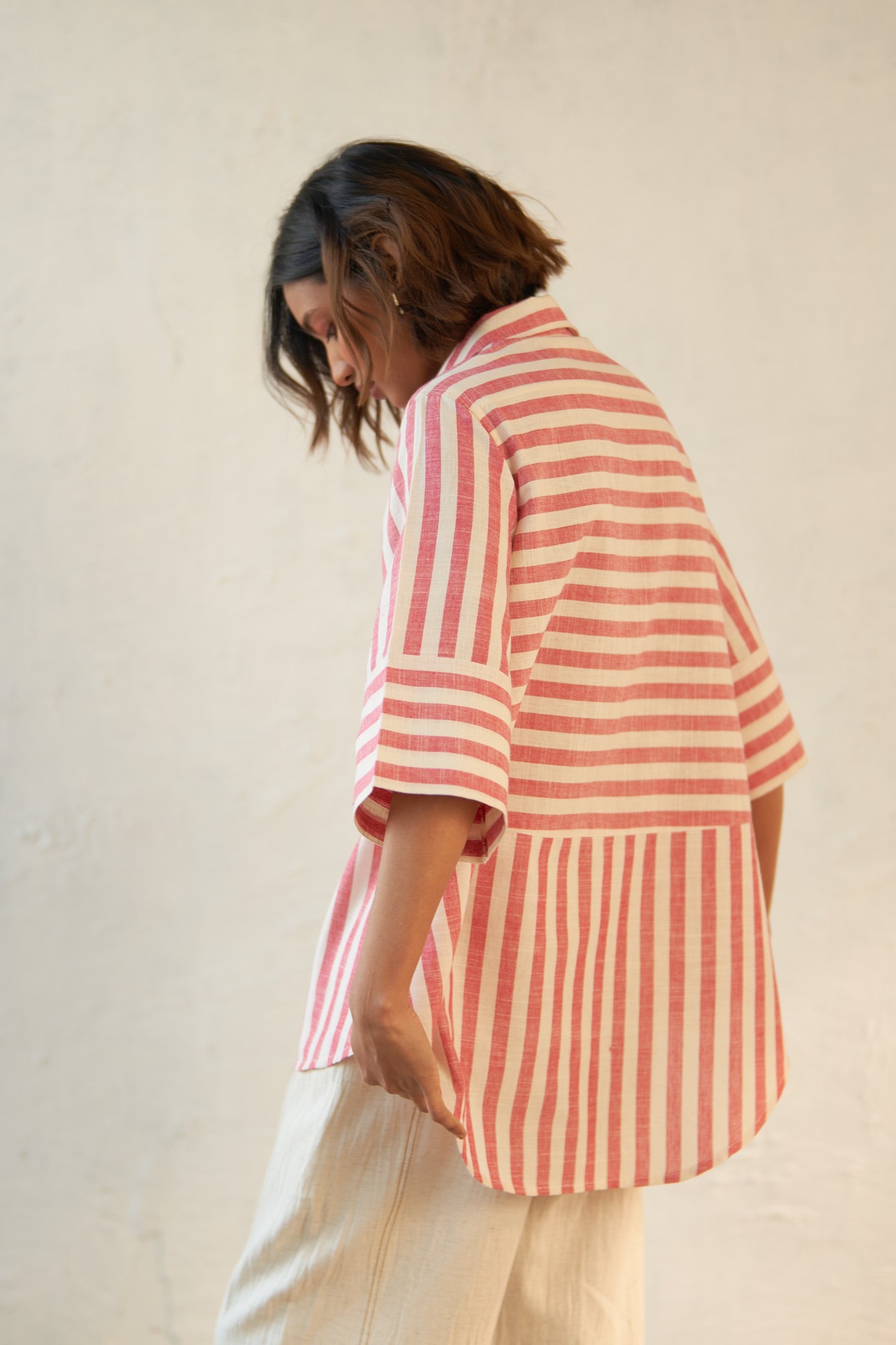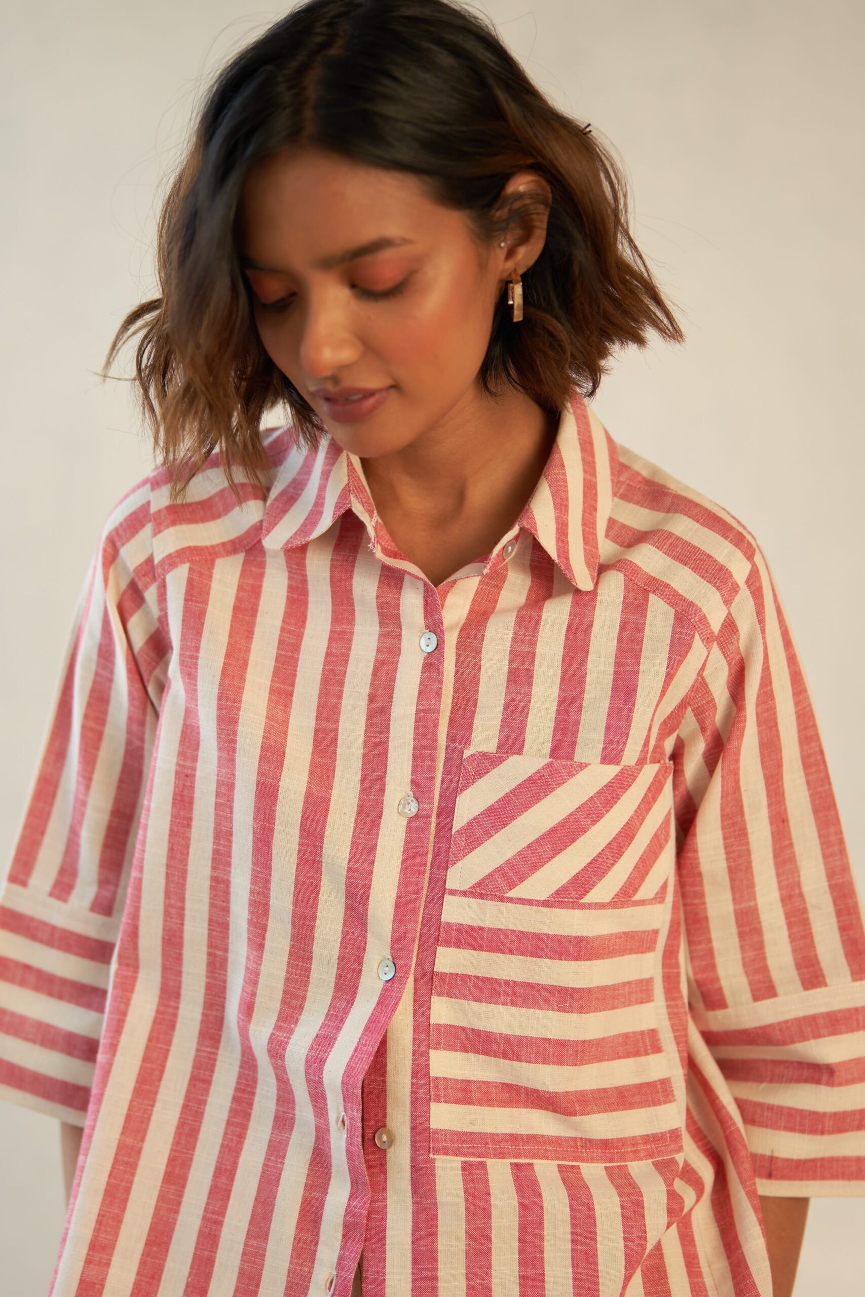 A perfect blend of refined tailoring and effortless, airy silhouette, this hi-lo red striped shirt is a must-have for your wardrobe. It features a patch pocket, curved hemline, and elegant shell buttons. The directional play of lines, along with the hi-lo silhouette, makes for a fun outfit. Pair it with our flex loop pants for a comfortable fit.