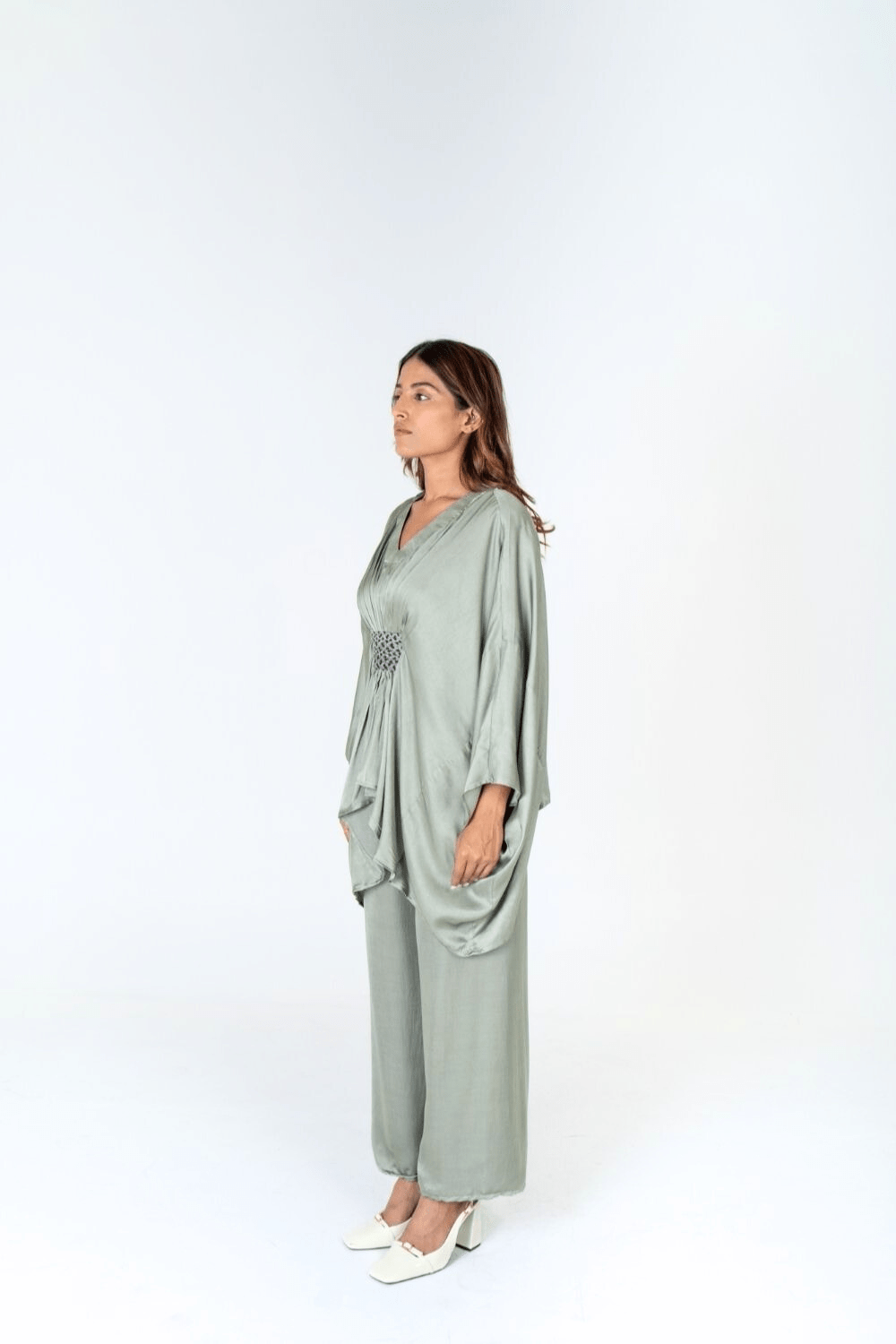 This elegant co-ord set in green and purple features a braided patch detail at the front, showcasing intricate craftsmanship. The upperwear is gathered and includes a tie-up feature inside, ensuring a perfect fit for any size and shape. Paired with matching pants, the set exudes a harmonious blend of style and comfort. Ideal for both casual outings and special occasions, this ensemble promises effortless sophistication with its versatile design.