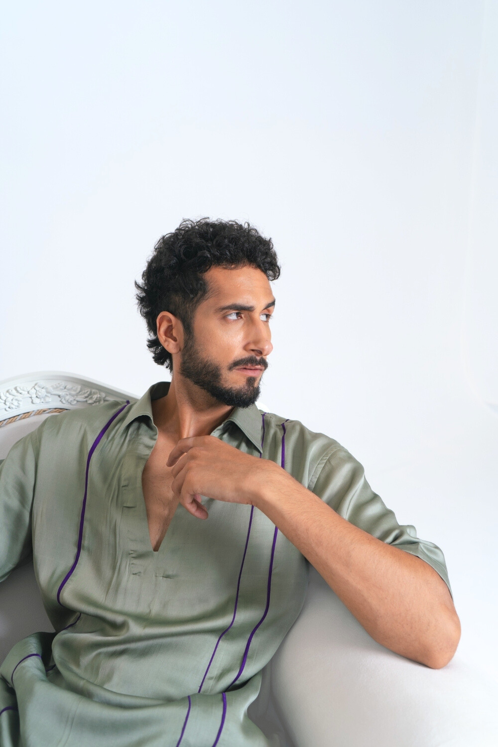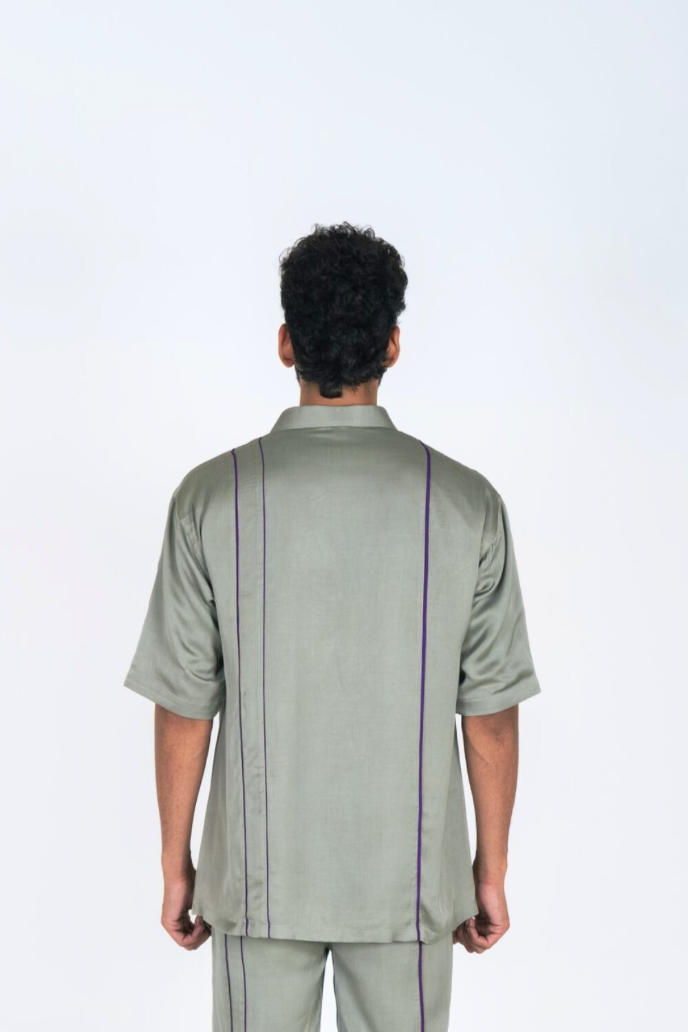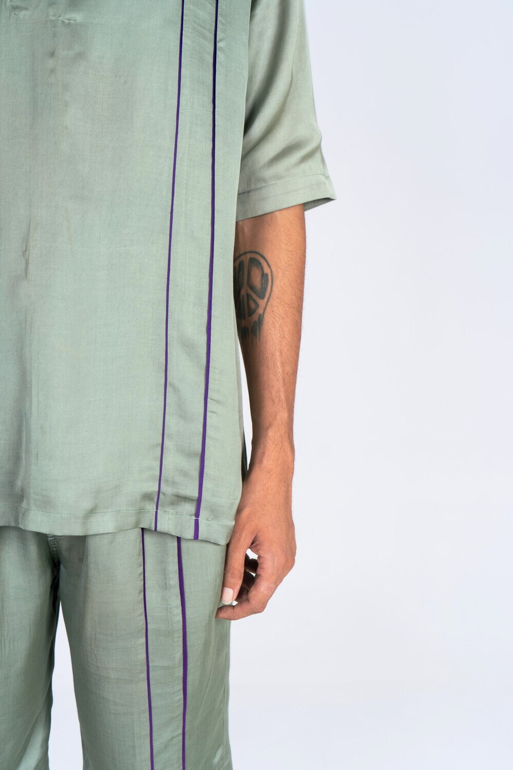 This stylish t-shirt combines comfort with modern design elements. It features a low neckline for a relaxed fit and is crafted in a vibrant green color. Adding a touch of contrast and sophistication, it is detailed with purple piping along the edges, enhancing its overall look. Perfect for casual wear, this t-shirt offers a laid-back yet stylish appeal, ideal for everyday outings and adding a pop of color to your wardrobe with its unique piping detail.