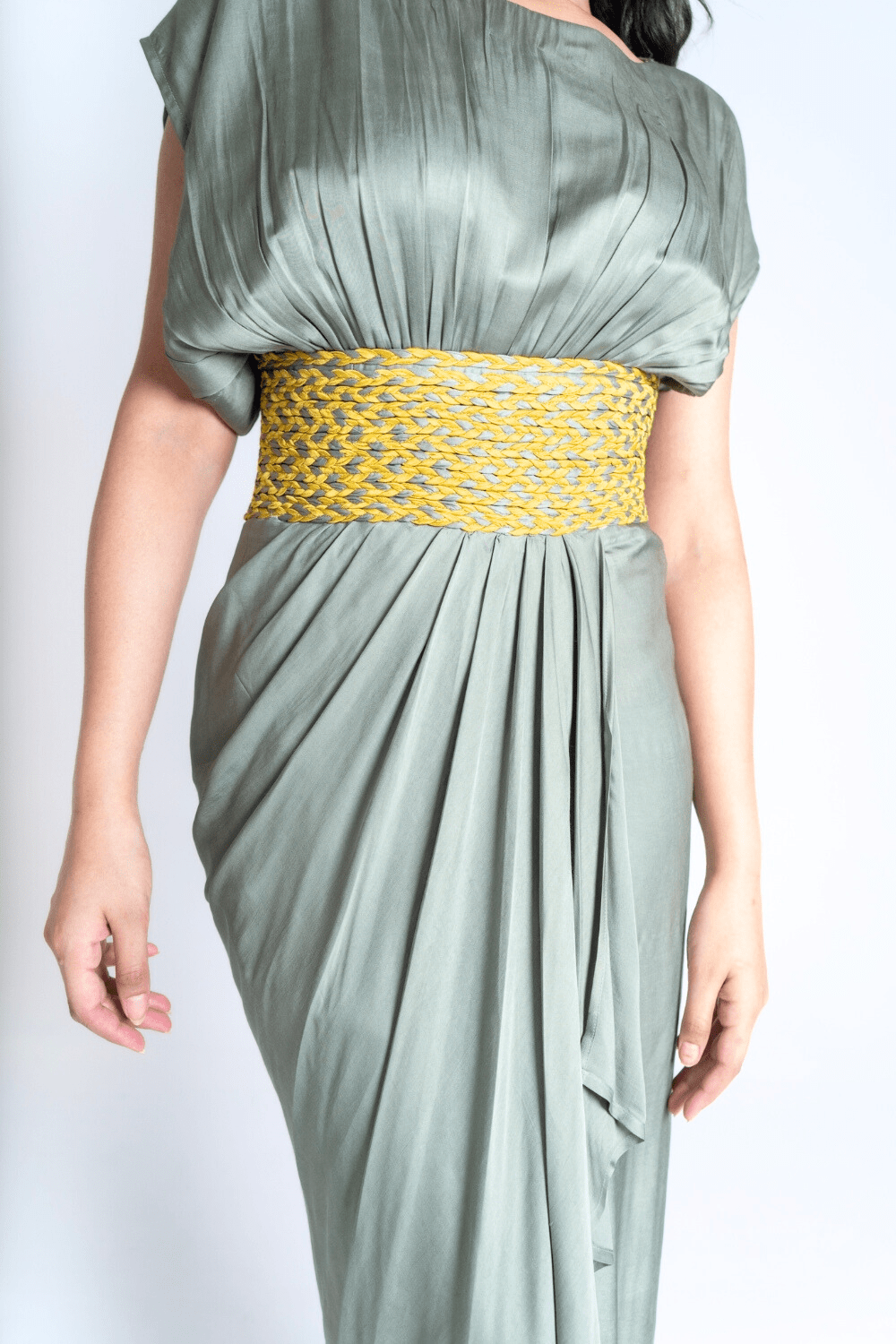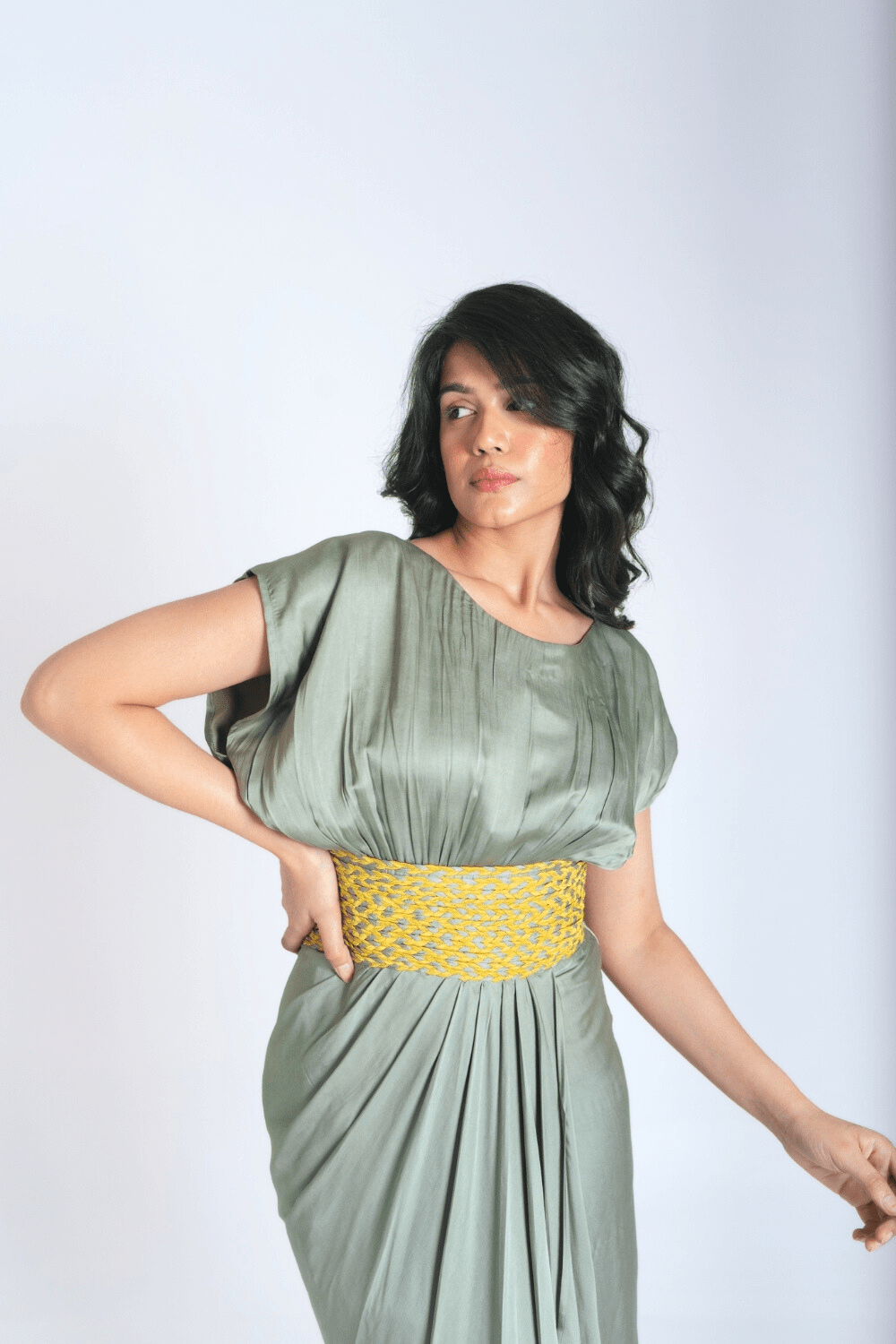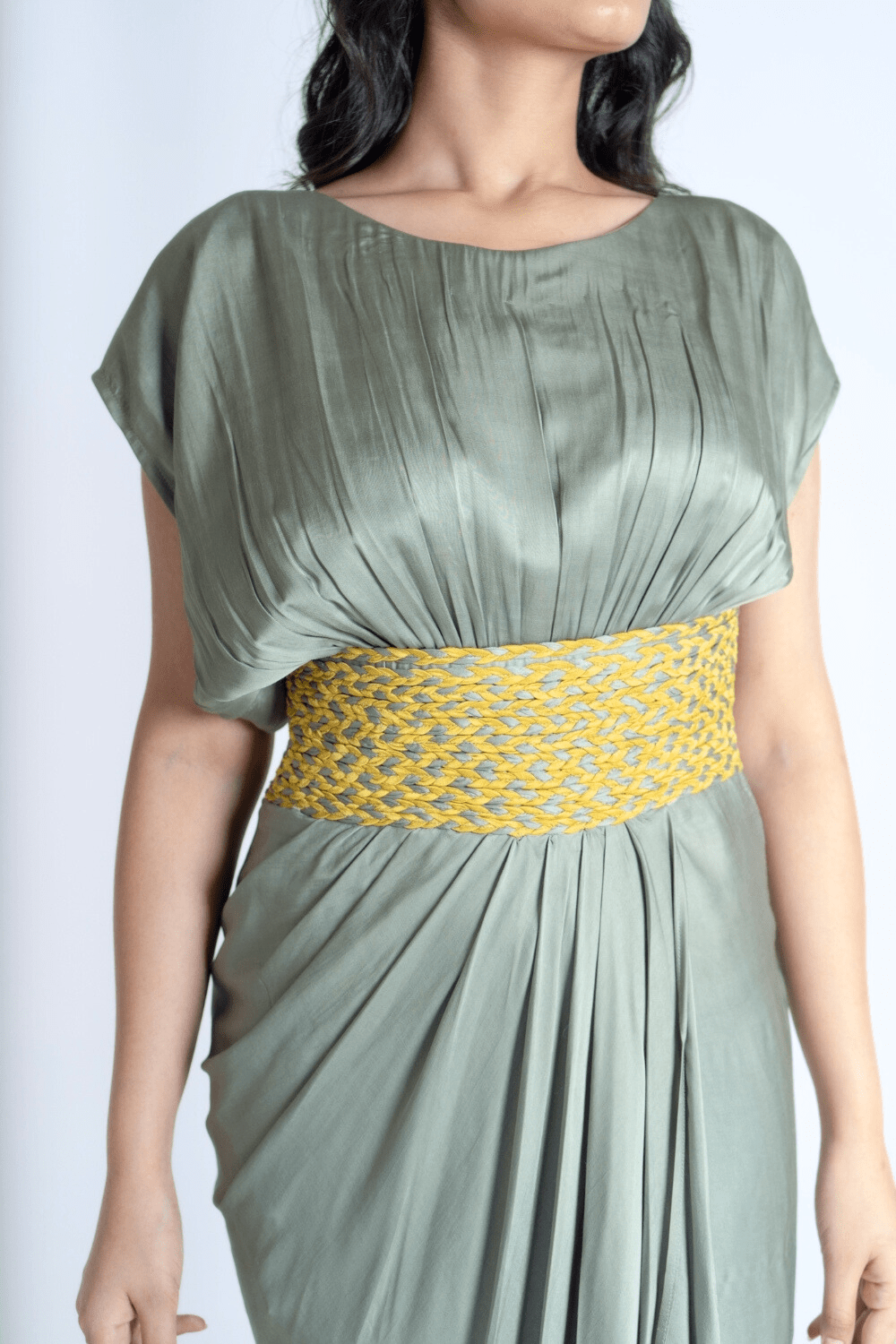 This enchanting cocktail gown in green and yellow features a round neck and mega sleeves, exuding a bold yet sophisticated charm. The bottom is elegantly draped, adding a touch of fluidity and grace to the silhouette. Intricate braided detailing enhances its artisanal appeal, making it a captivating choice for evening events and cocktail parties.