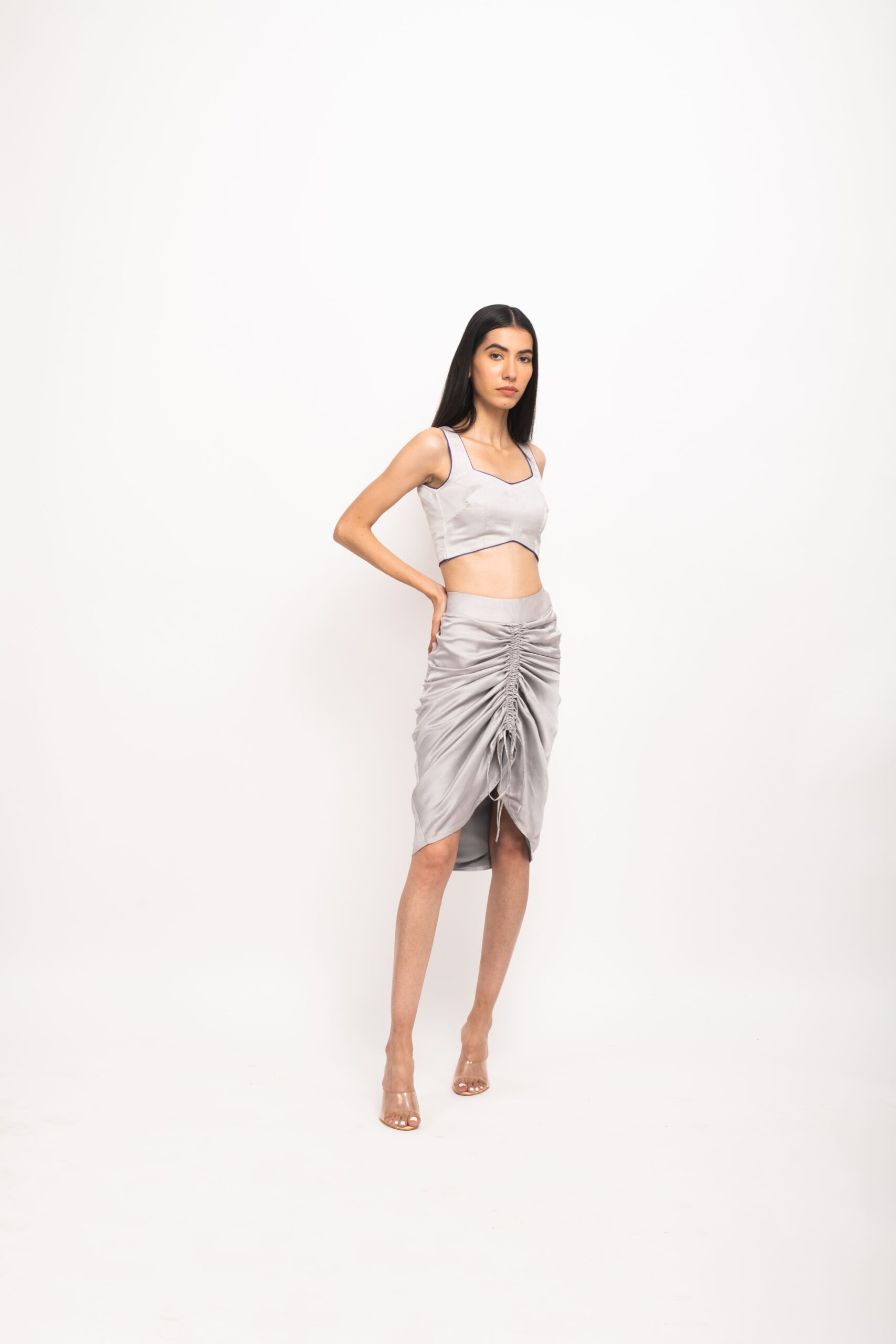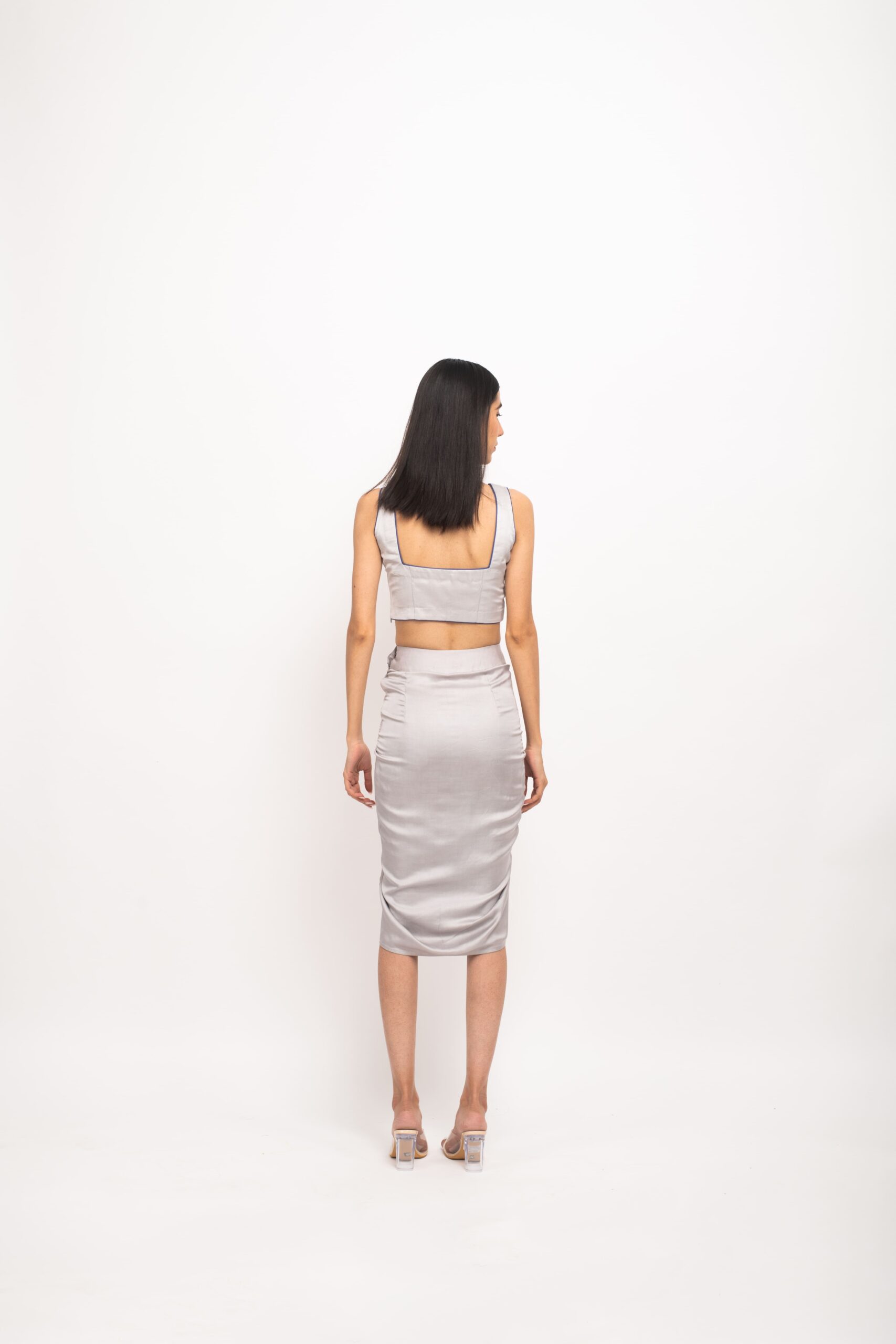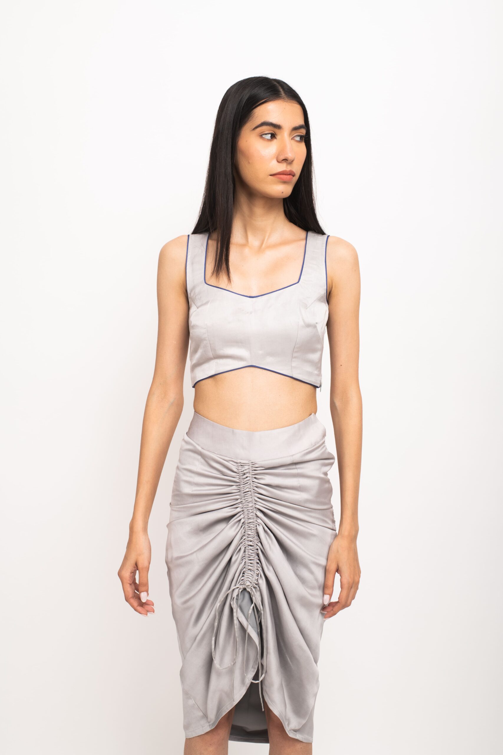 This stylish ensemble features a grey bustier adorned with elegant blue piping throughout, paired seamlessly with a grey skirt that boasts flattering ruching at the front. It combines classic sophistication with a modern twist, perfect for upscale events and stylish occasions where you want to look polished and fashionable.