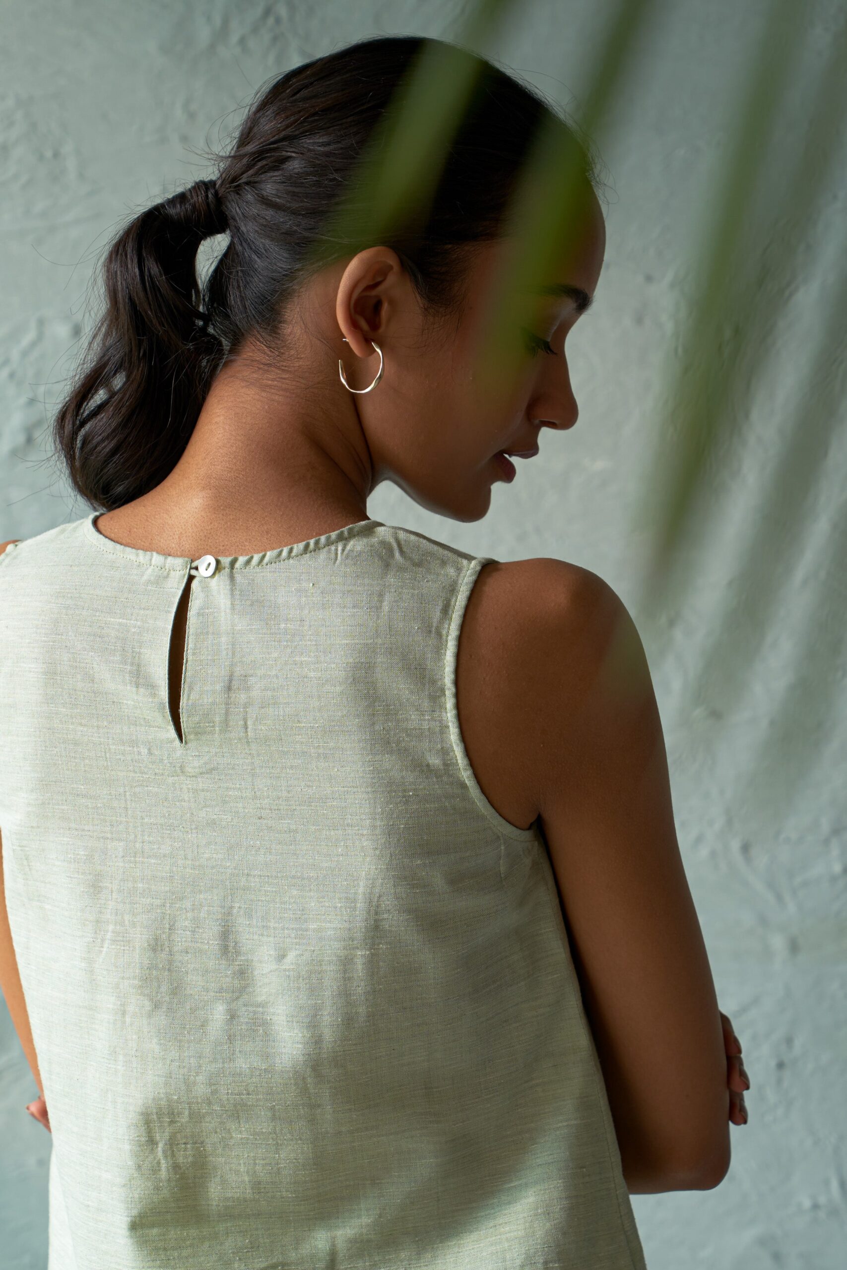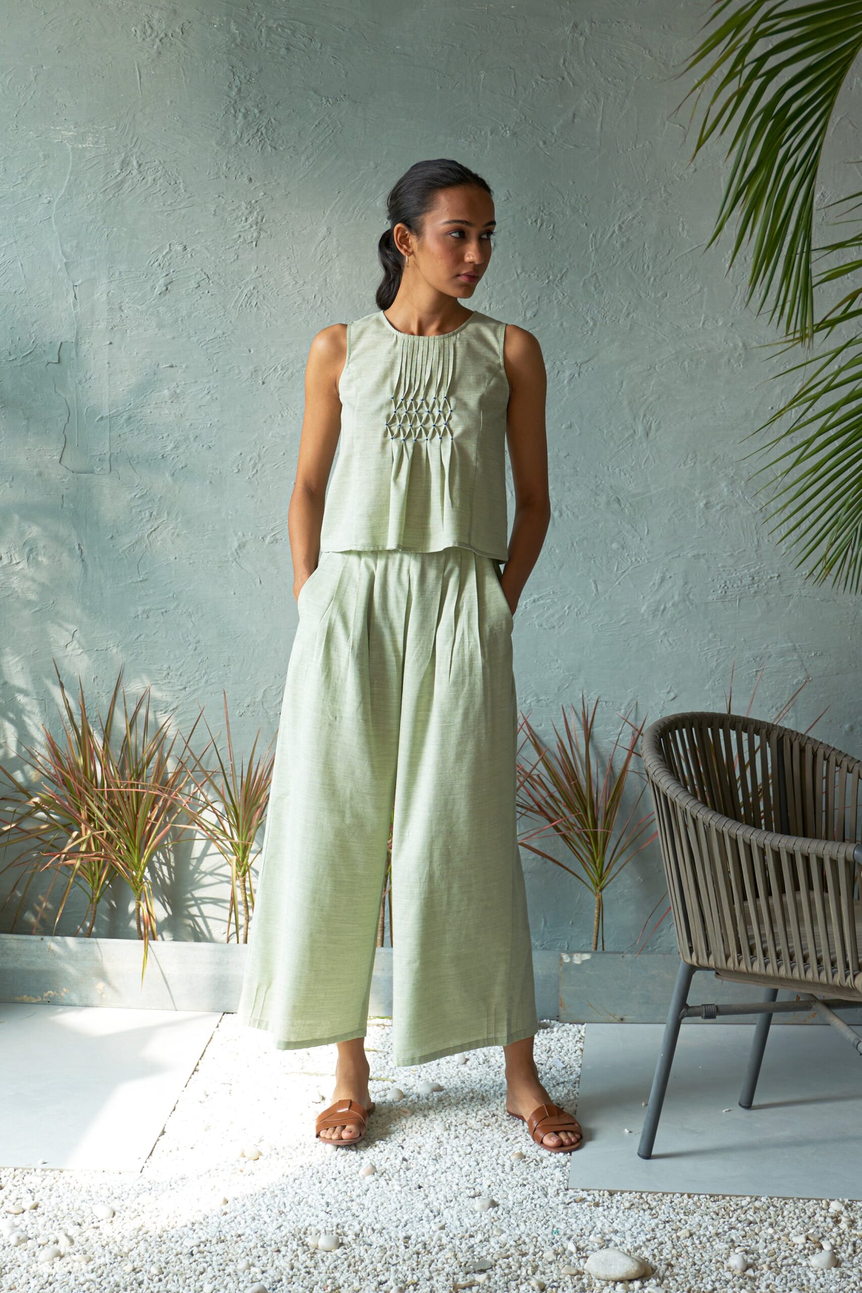 A refreshing matcha-green sleeveless top with delicate smocking detail on the front. Paired with “Lime Spritz” bottoms, featuring a front belt and an elasticated back waistband for a perfect fit. These ankle-length pants showcase a wide-leg opening and elegant pleat detailing in the front. Crafted from lightweight, breathable fabric for all-day comfort.