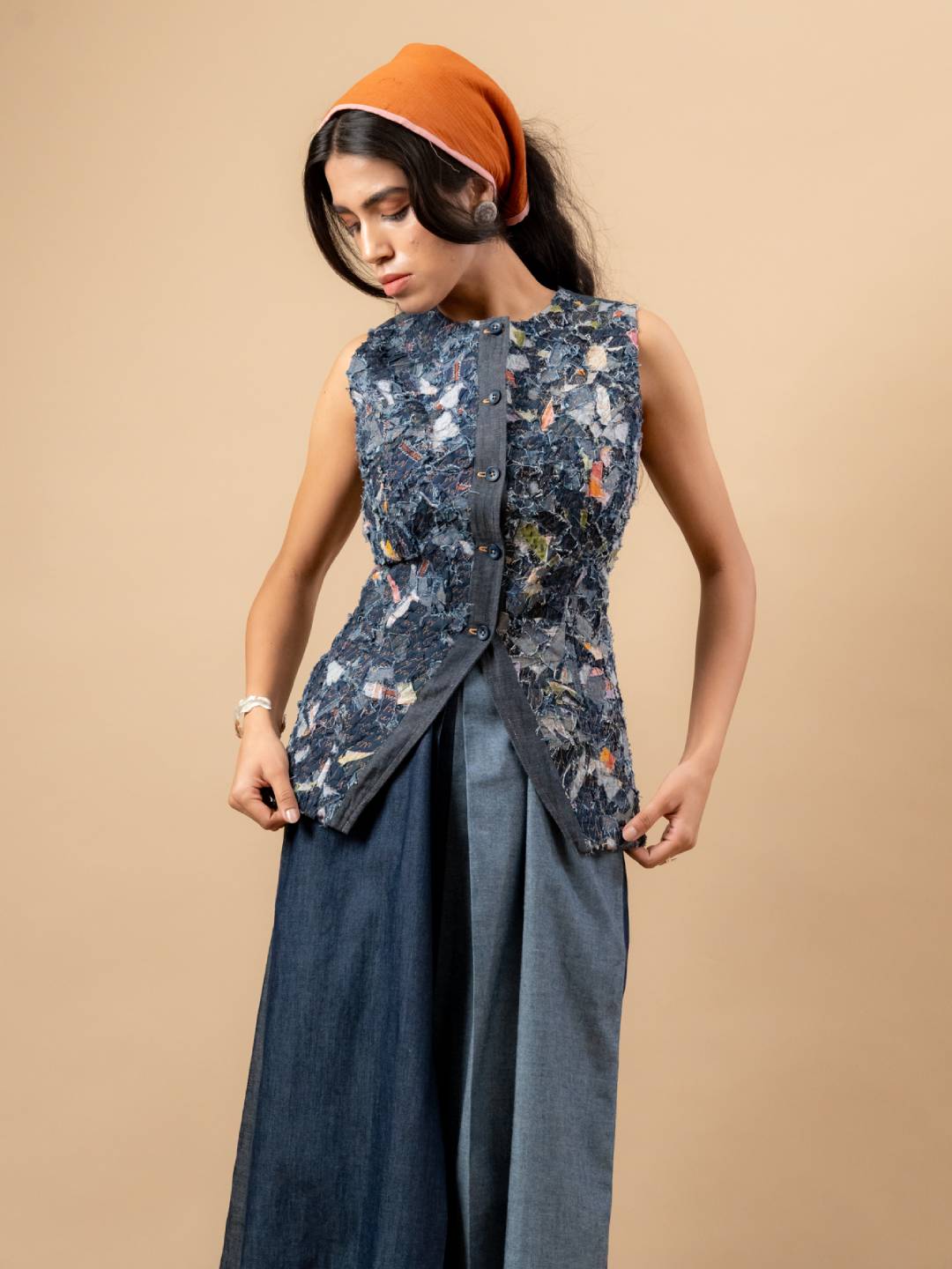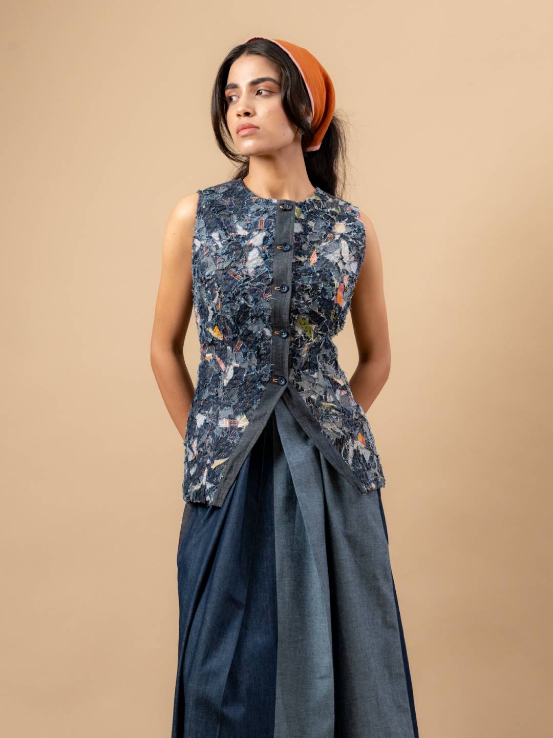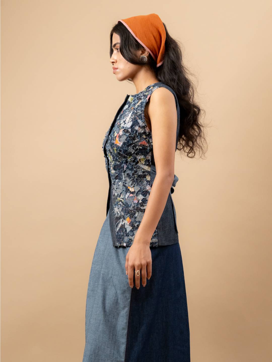 Textured, fitted denim waistcoat made from waste, with adjustable belt at the back.