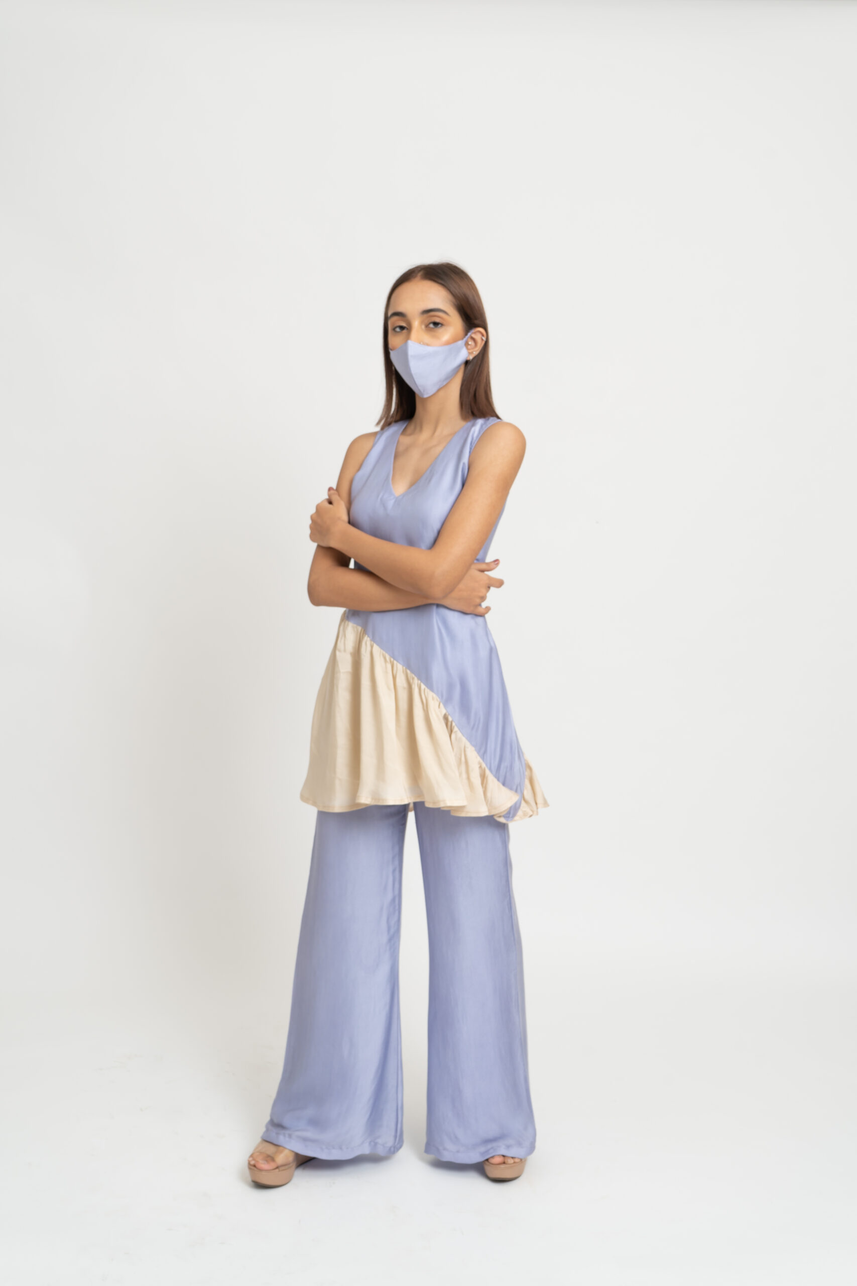 The Lilac and Beige Colorblocked Sleeveless Tunic combines serene hues with a modern silhouette. Paired elegantly with wide-legged Lilac Pants, this ensemble offers both comfort and style. Ideal for various occasions, it blends sophistication with a relaxed yet polished aesthetic.
