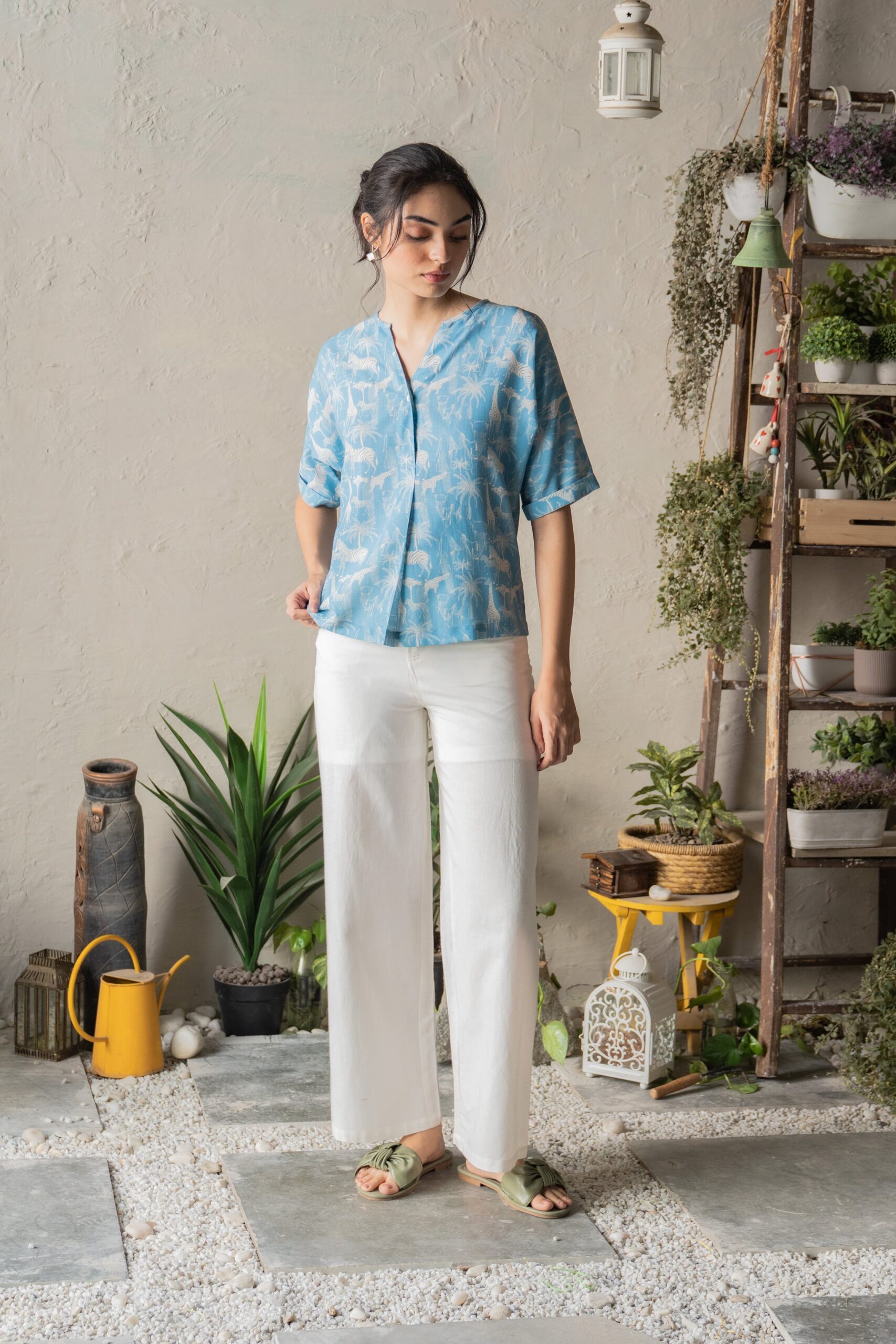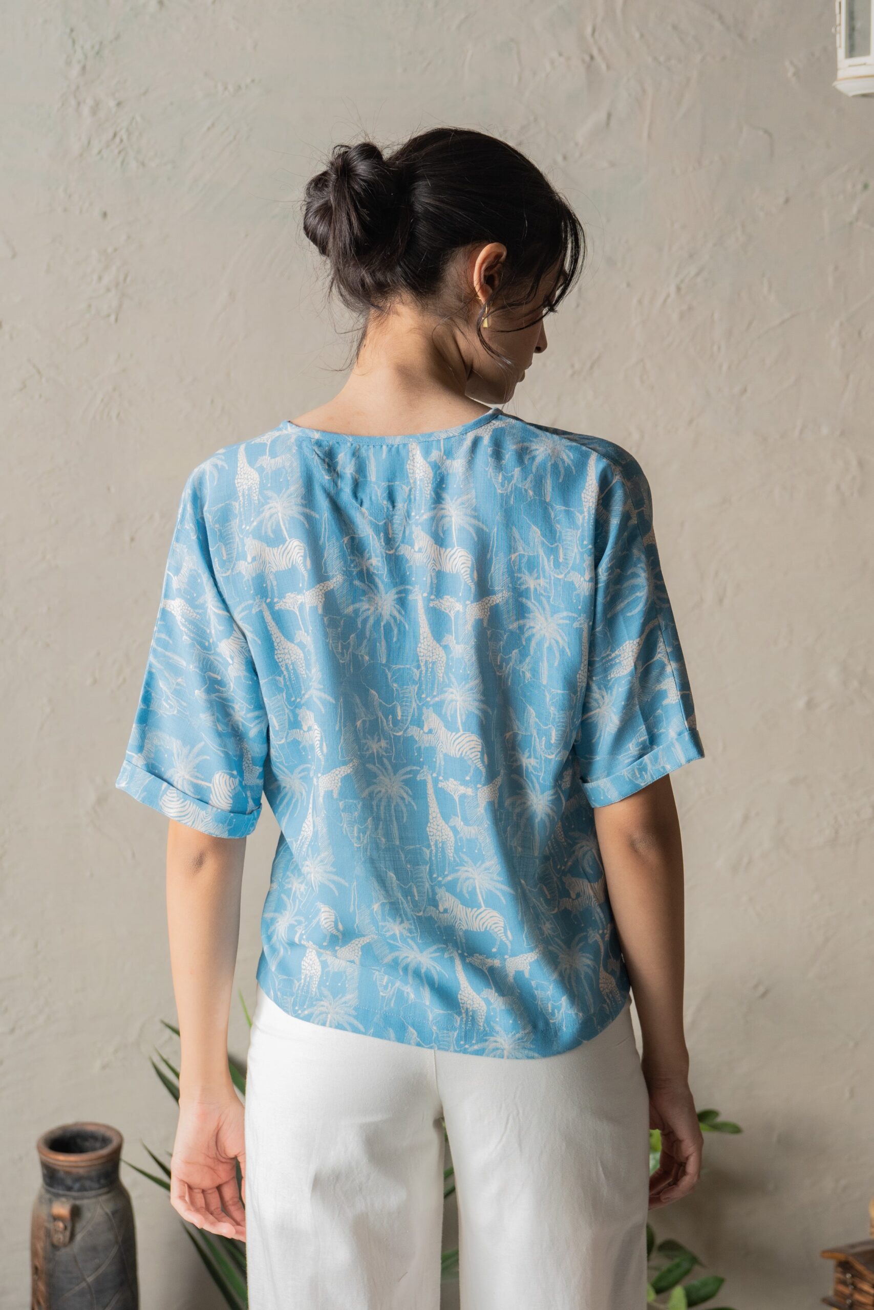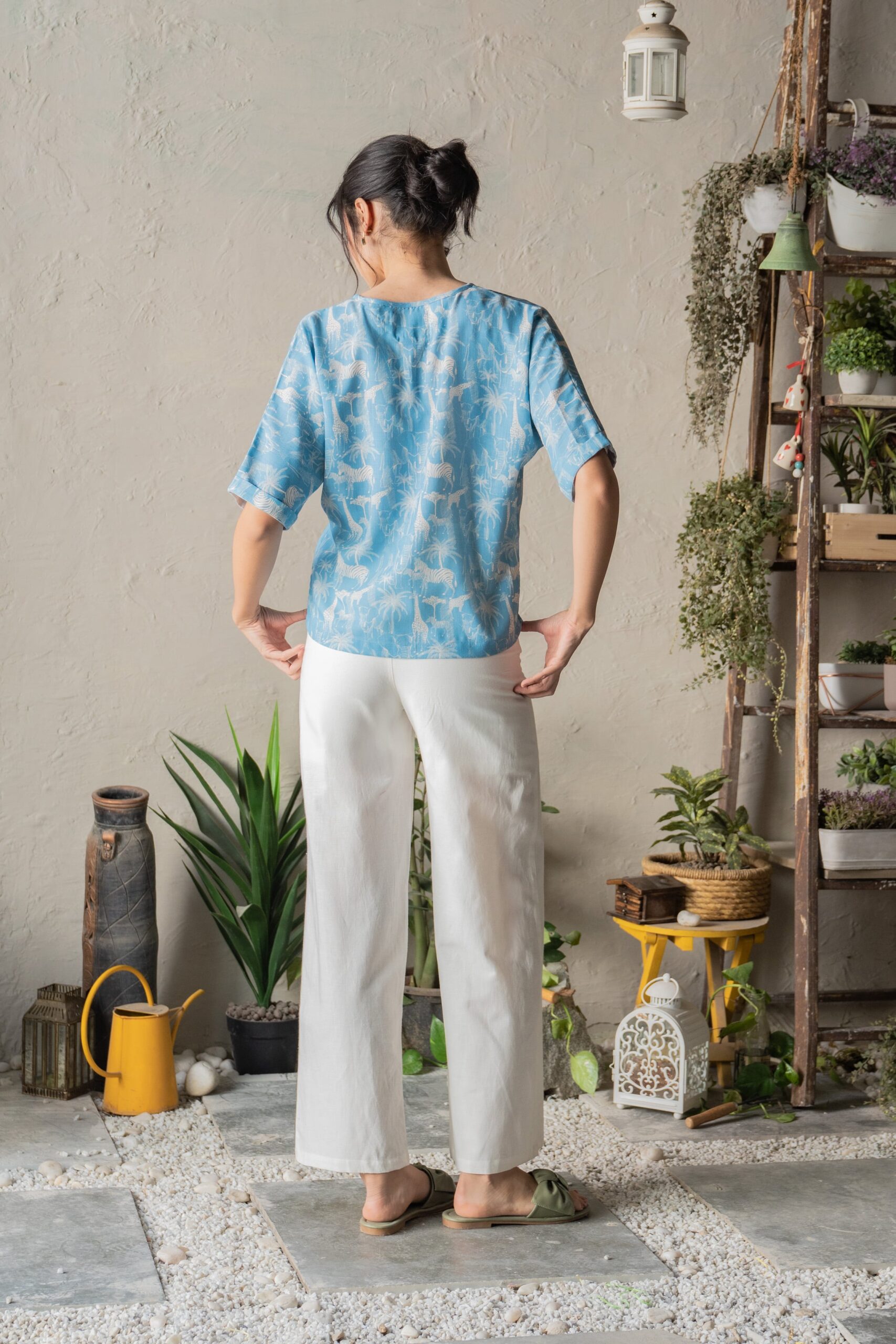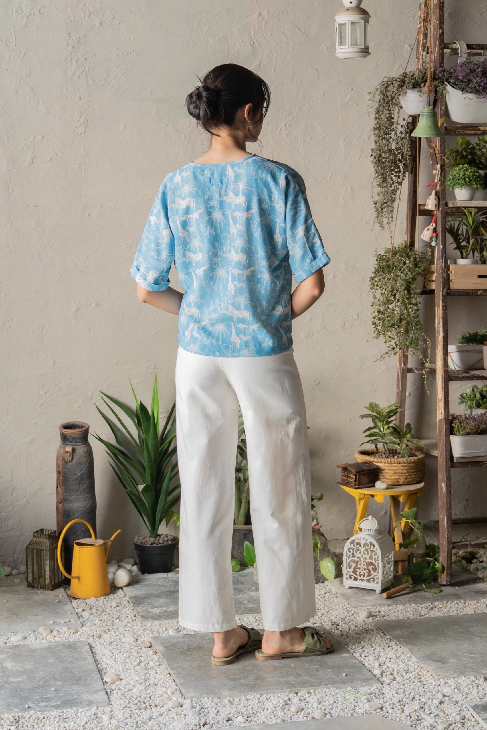 The Maasai Mara Set captures the essence of contemporary elegance with a breezy top in a light blue hue and jungle print. The top features a distinctive front box pleat detail, enhancing its relaxed yet sophisticated silhouette. Paired with high-waisted straight pants, this set is designed with a fitted waist and a classic tailored cut, offering versatility for both casual outings and adventurous explorations. Slightly sheer, the pants include a short lining for added comfort and modesty.