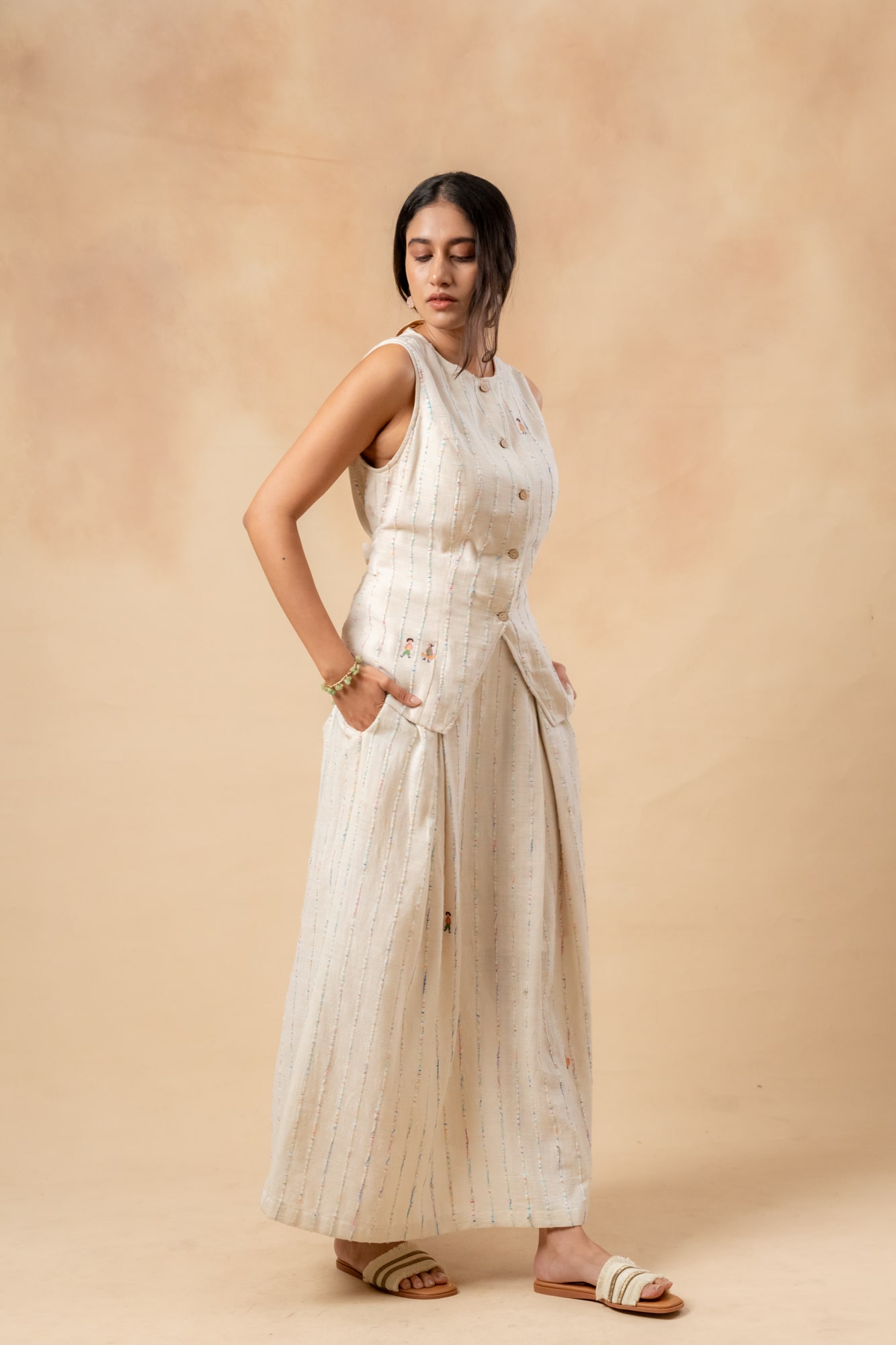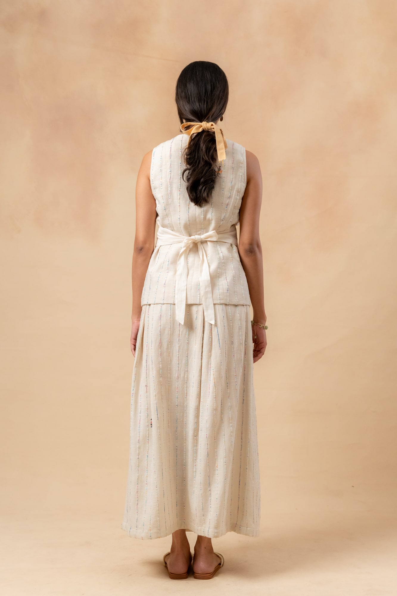 Fitted handwoven waistcoat made from upcycled textured fabric waste, featuring an adjustable belt at the back.