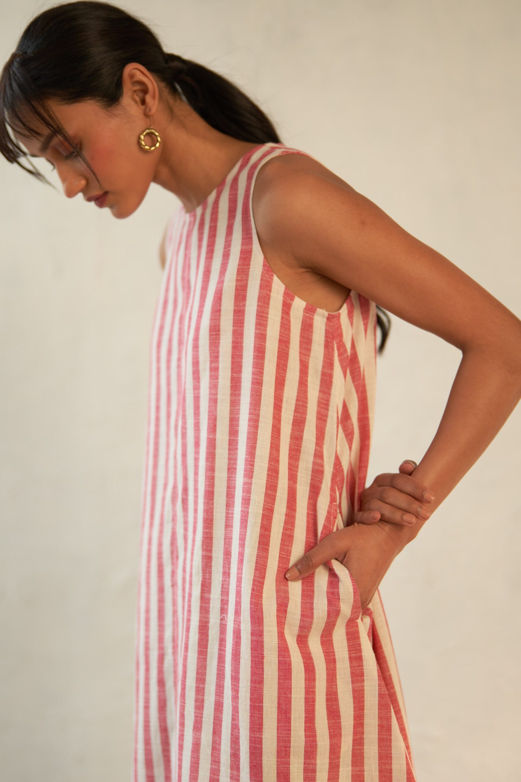 The classic mini takes on a new guise with Canoopi’s striped fringed short dress. This dress nods to all things cool with its round neck, deep arm cuts, fringed hem, and breezy silhouette. Perfect for a leisurely day out or a stylish lunch.