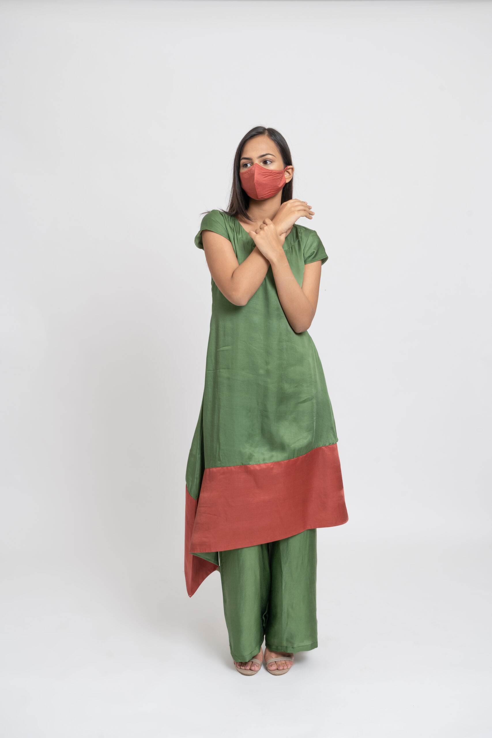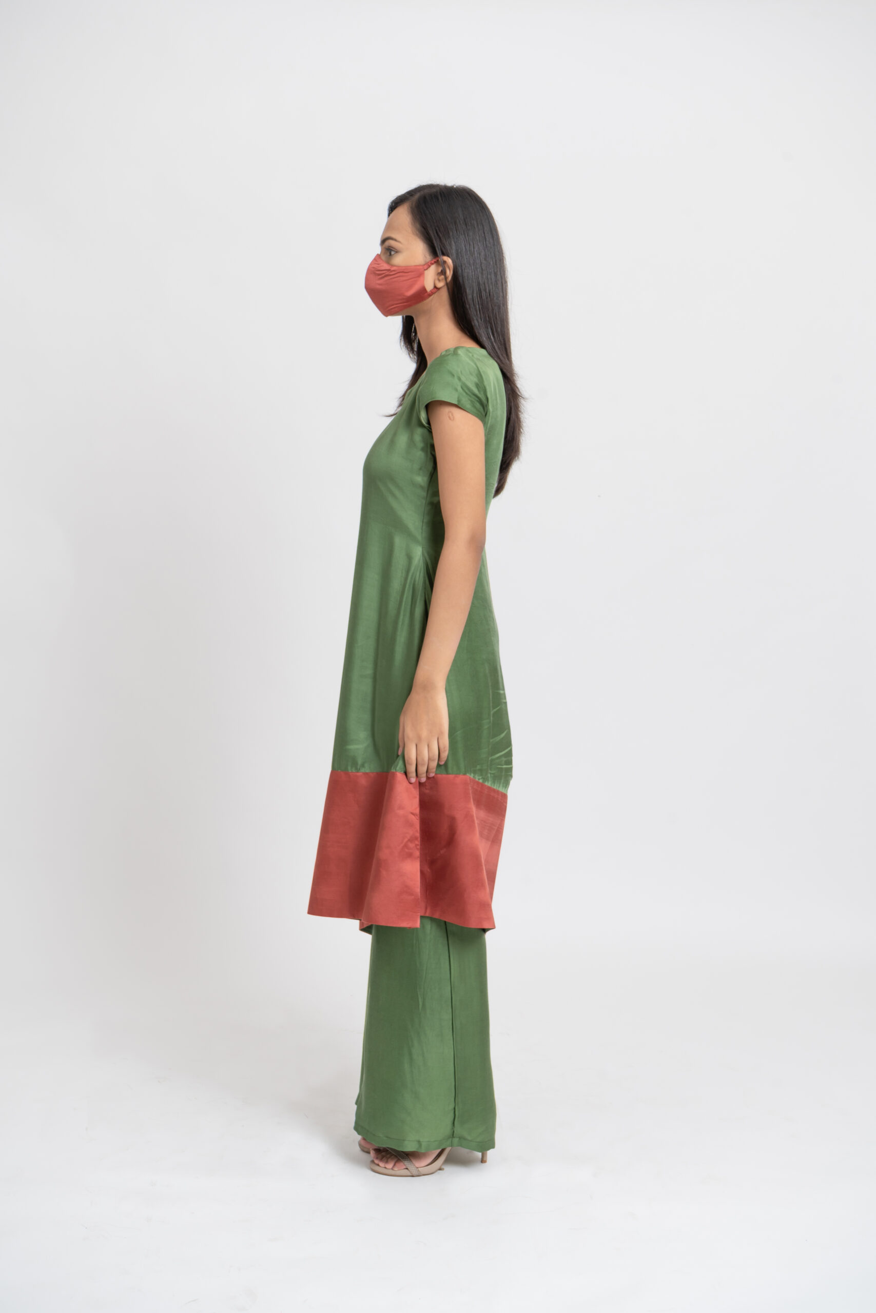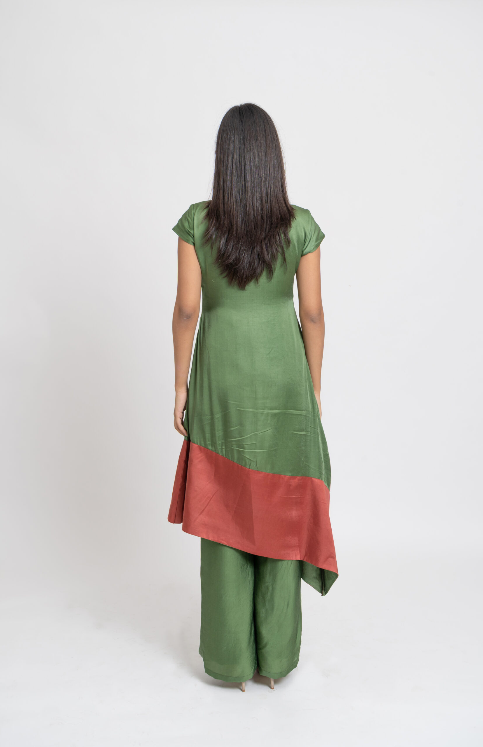 The Olive Green and Crimson Asymmetrical Kurta exude contemporary charm with its unique color combination and asymmetric design. Featuring chic cap sleeves and a fluid silhouette, it pairs seamlessly with the wide-legged Olive Pants for a sophisticated ensemble. Perfect for both formal and casual settings, this outfit combines elegance with modern flair, ensuring a standout presence with its versatile and stylish appeal.