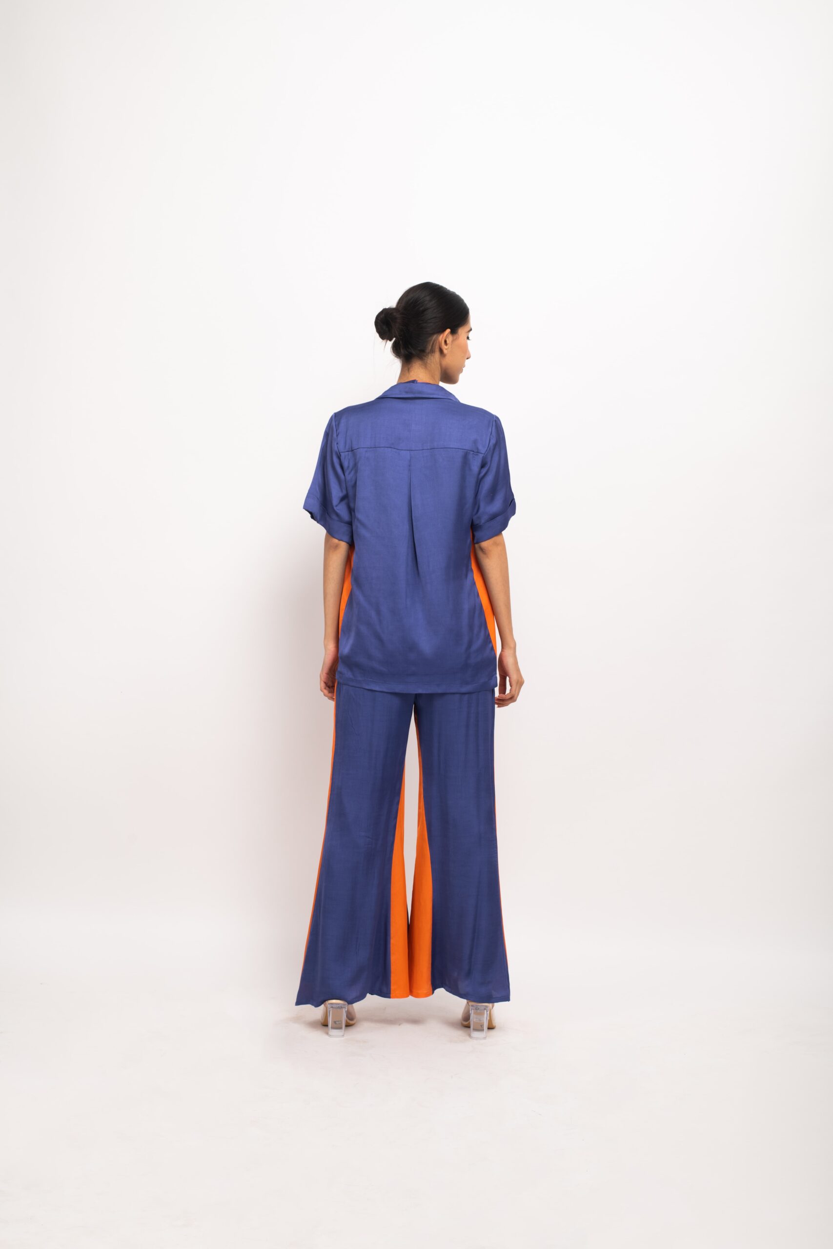 This striking three-piece co-ord set in vibrant orange and blue features a stylish ensemble perfect for making a statement. It includes an orange halter neck bustier, crafted to enhance the silhouette with a modern twist. Paired elegantly with an orange-blue paneled shirt, the set exudes sophistication with its color-blocking design. Completing the ensemble are orange-blue paneled flared pants, offering both style and comfort with their flattering silhouette. Together, this co-ord set combines boldness with elegance, making it ideal for both casual outings and memorable occasions where fashion and flair are paramount.