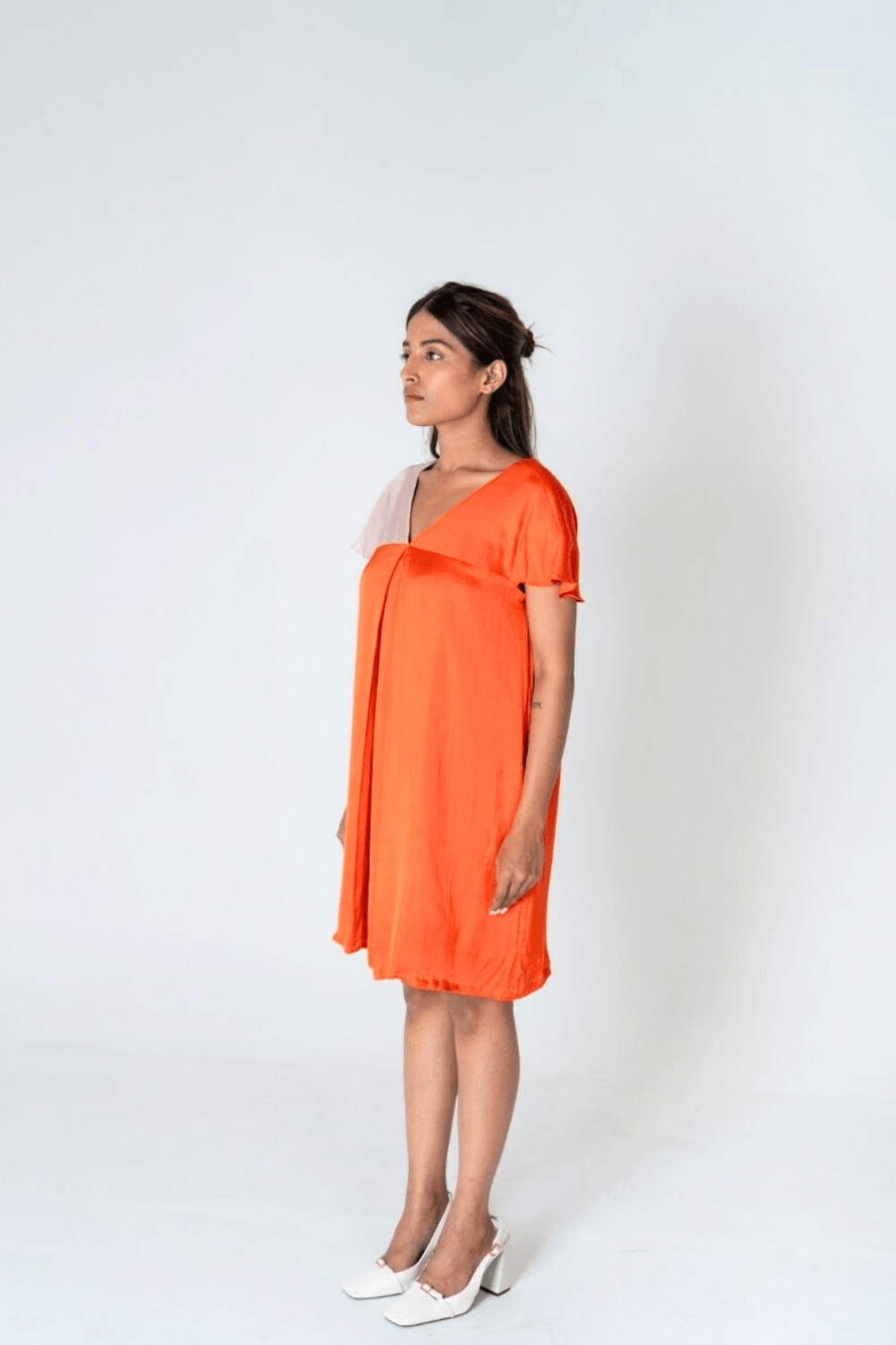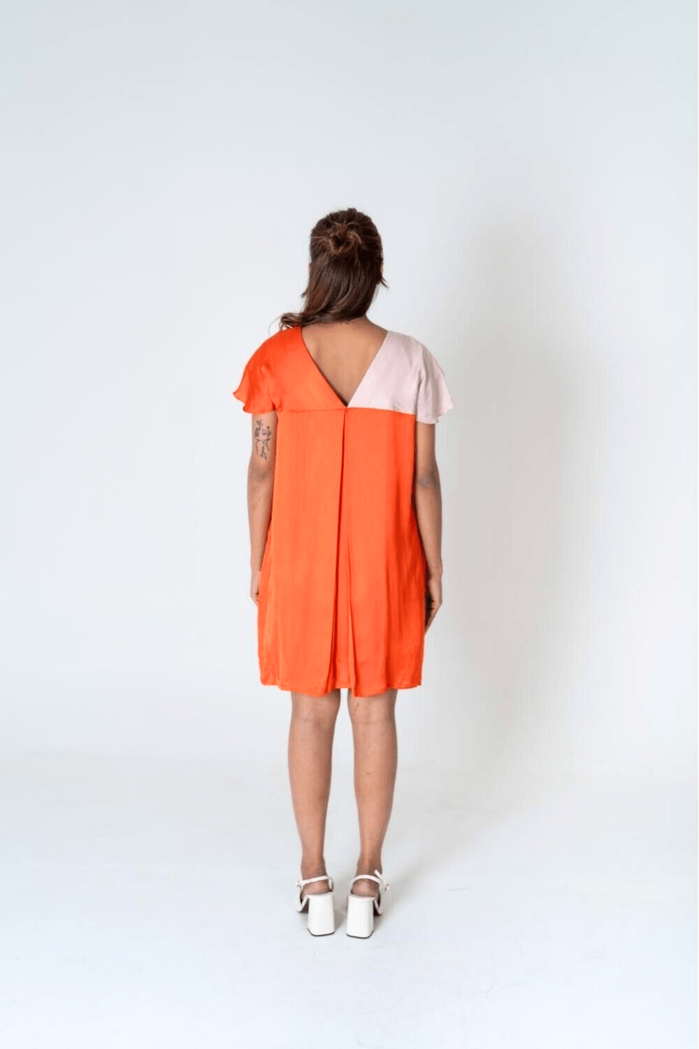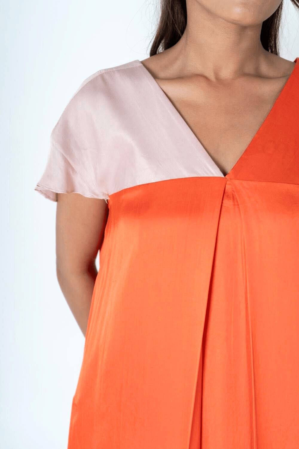 This fun and colorful orange-pink color-block short dress features eye-catching mega sleeves and a handy pocket on the left side. With its flattering V-neck and mid-thigh length, it’s the perfect mix of style and practicality for any occasion.