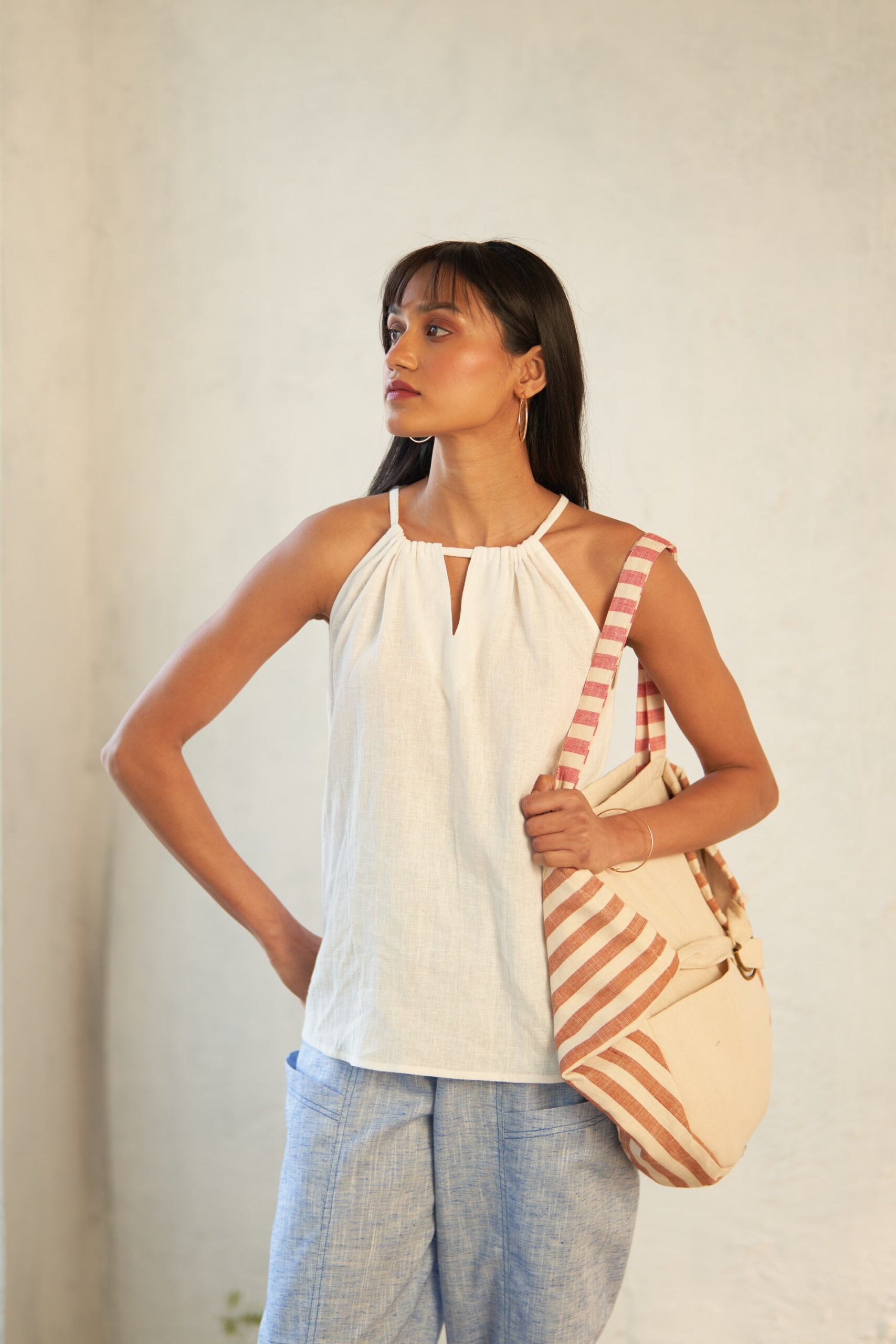 A fresh take on a classic favorite. Crafted from lightweight flex fabric in crisp white, it offers a breezy and effortless vibe for your easygoing day out. The tie-up neckline adds a stylish detail, creating soft gathers on both the front and back. With its cropped length, it pairs perfectly with high-waisted skirts, pants, or shorts, ensuring a versatile and chic look