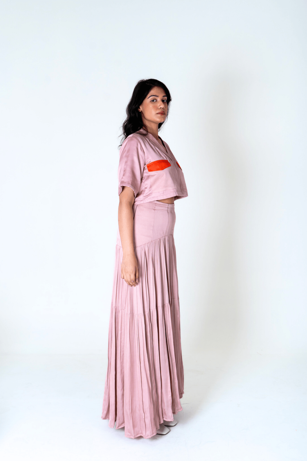 The maxi skirt in pink and orange is gathered, complementing the ensemble with its flowing silhouette. This detail makes it a versatile choice suitable for both casual outings and relaxed gatherings, offering comfort and style in one elegant package.