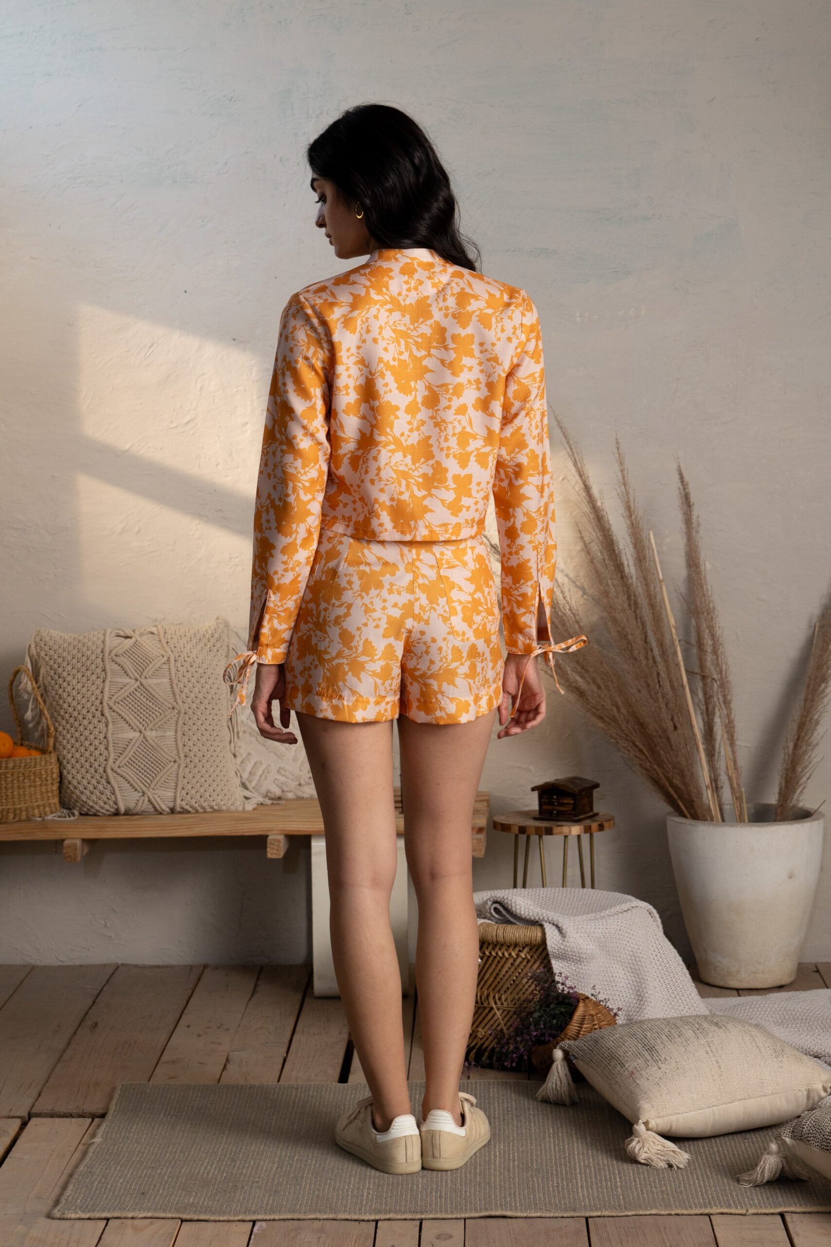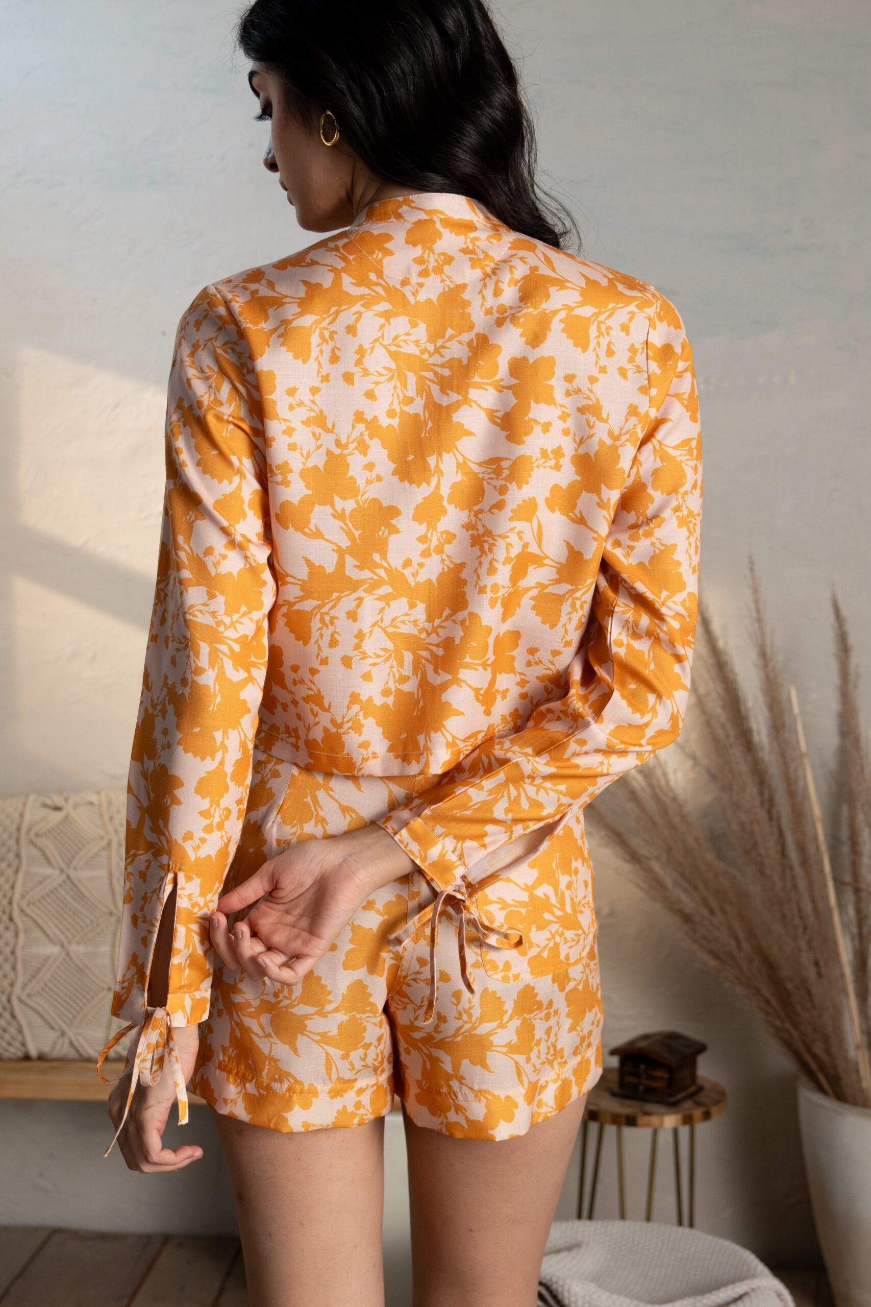 Radiate elegance with the Shalimar Glow Coord. The floral-printed cotton satin top features tie-up strings on the front placket and sleeves, a mandarin collar, and a V-neck, exuding timeless charm. Full sleeves add to its graceful silhouette, perfect for any occasion. Paired with high-waisted shorts that boast elegant pleats and functional side pockets, this coord set blends comfort with sophistication. Effortlessly transition from casual outings to chic statements with this versatile ensemble inspired by the glow of Shalimar.
