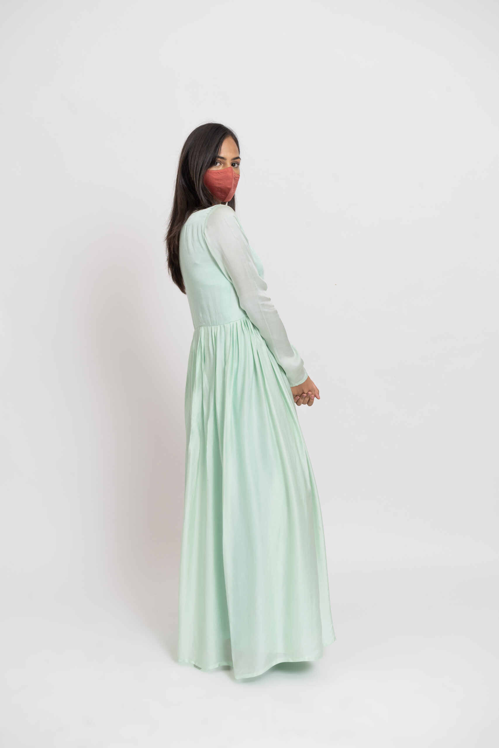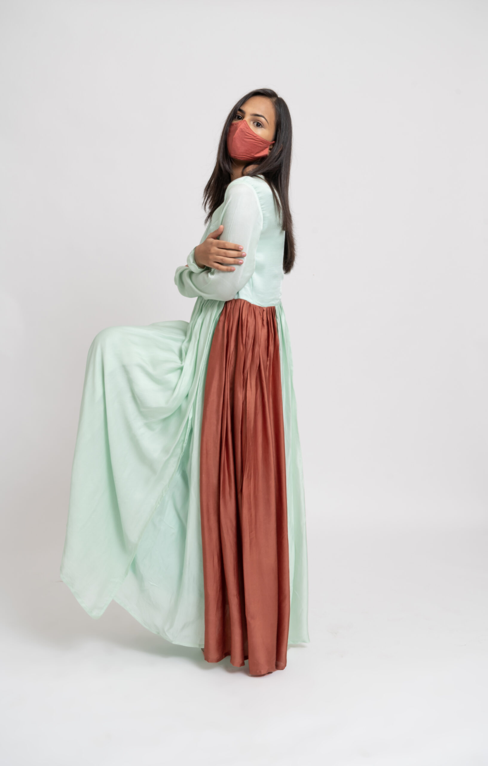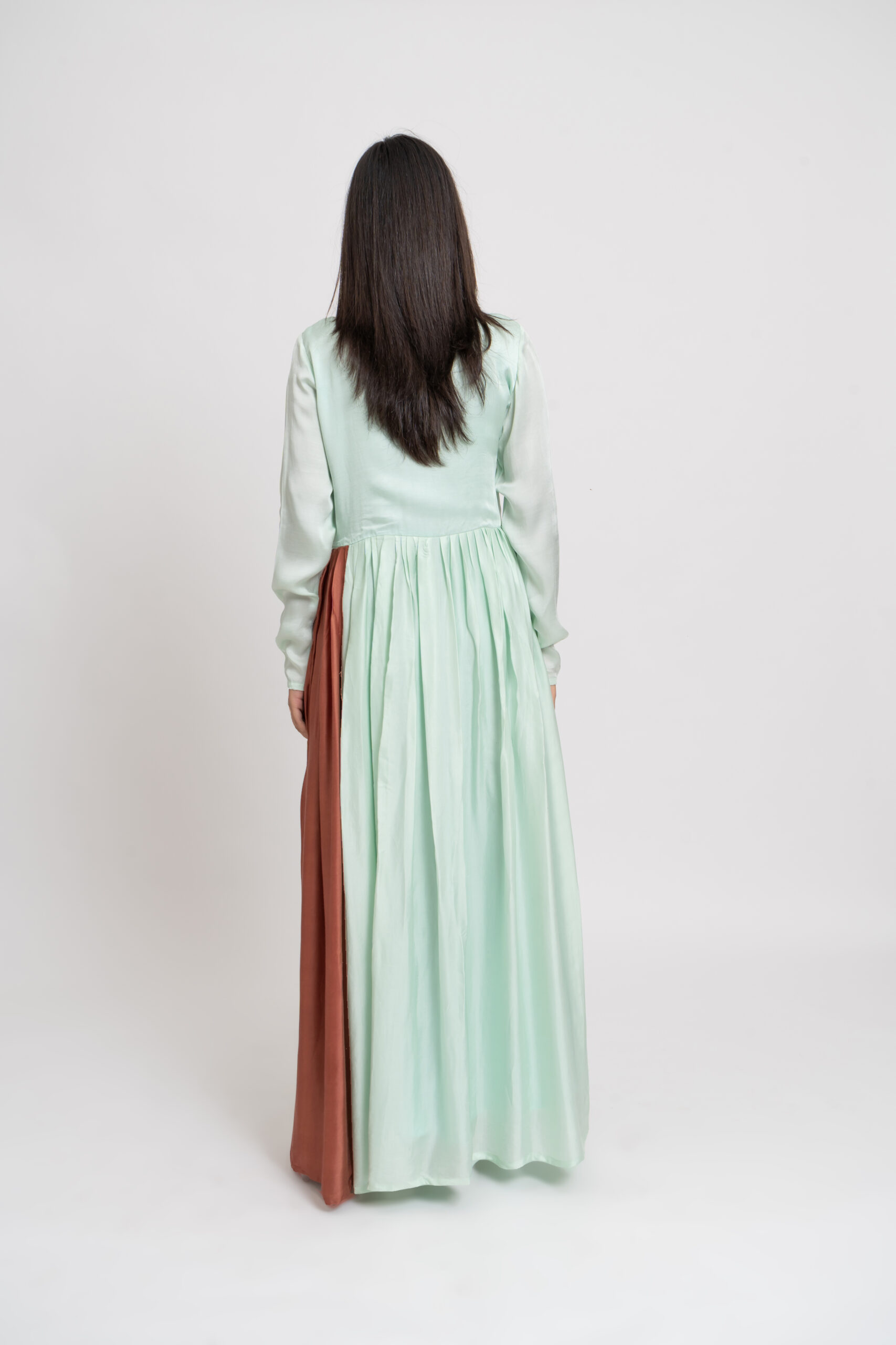 The Tea Green and Caramel Brown Angrakha showcase a traditional yet contemporary blend with its elegant gathers around the waist and full sleeves. This outfit exudes cultural richness and modern charm, perfect for adding a touch of sophistication to any occasion.