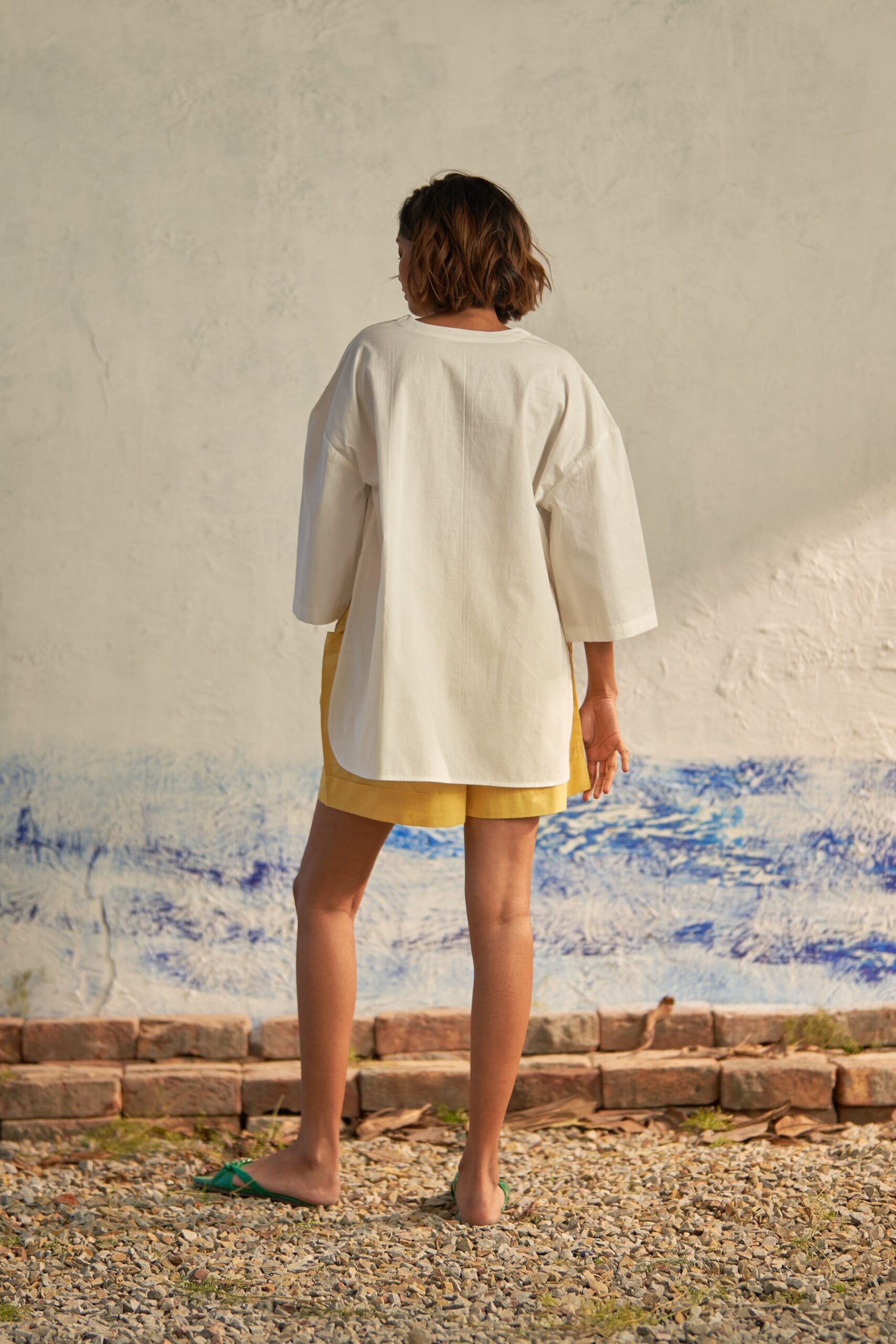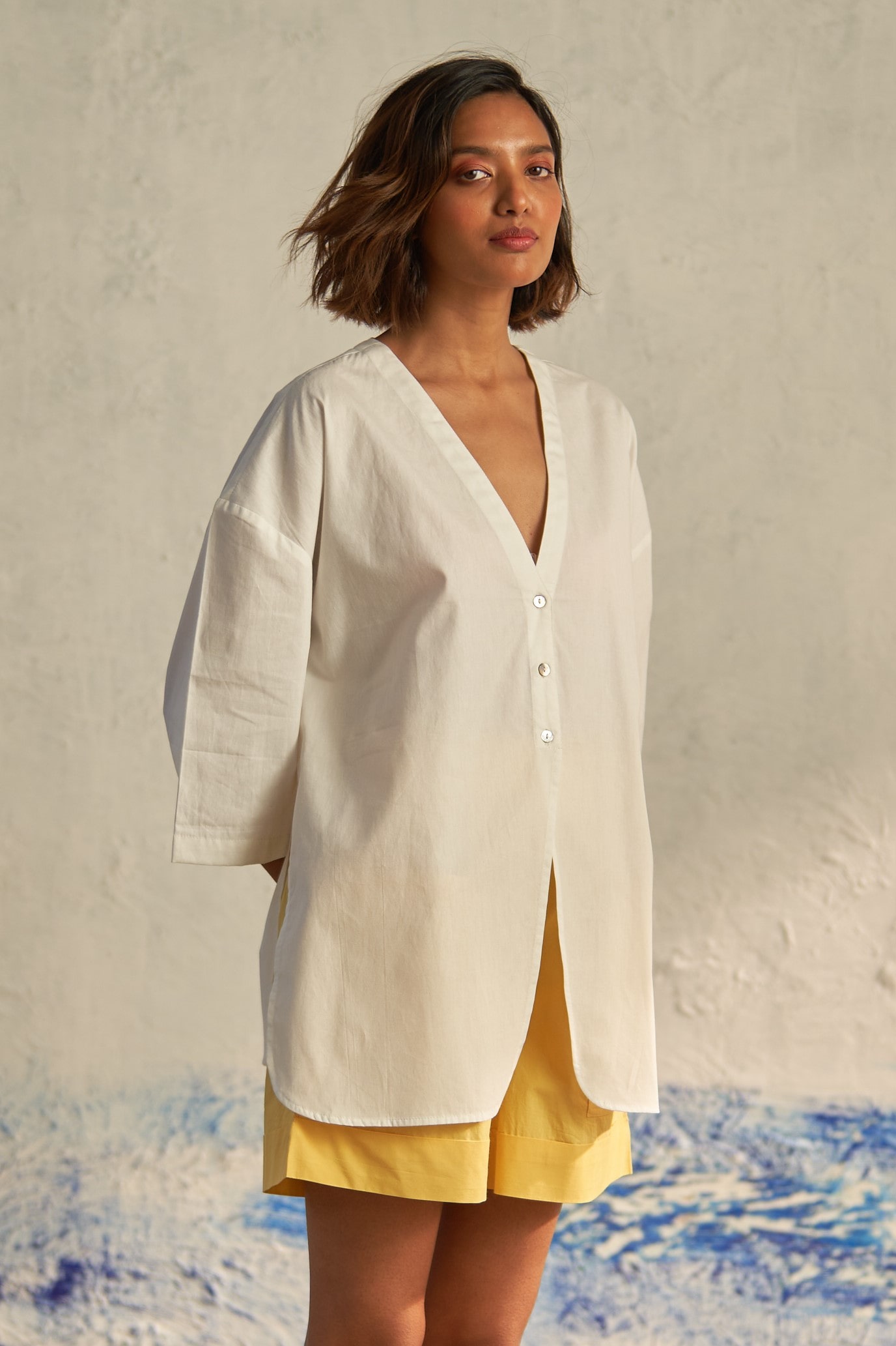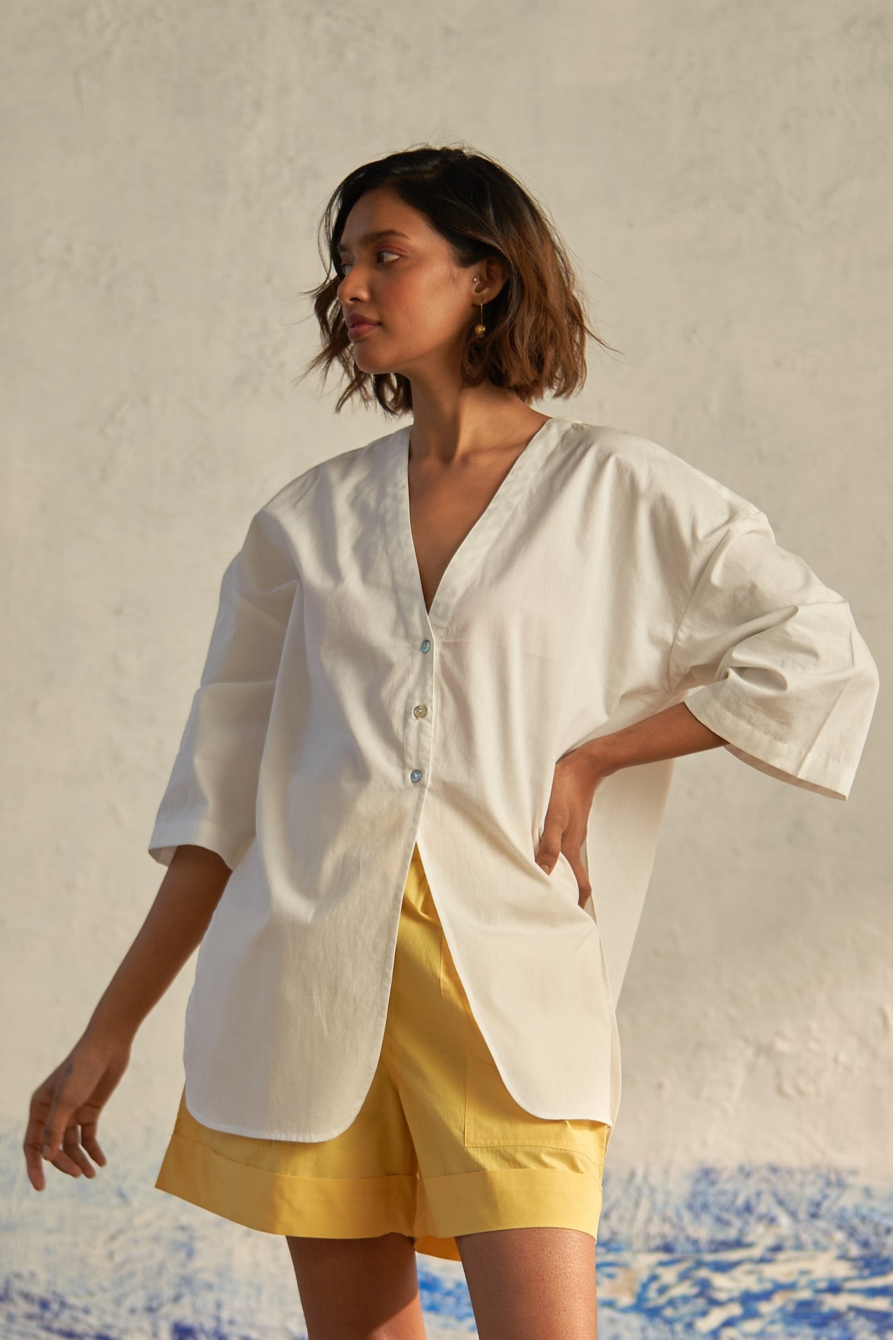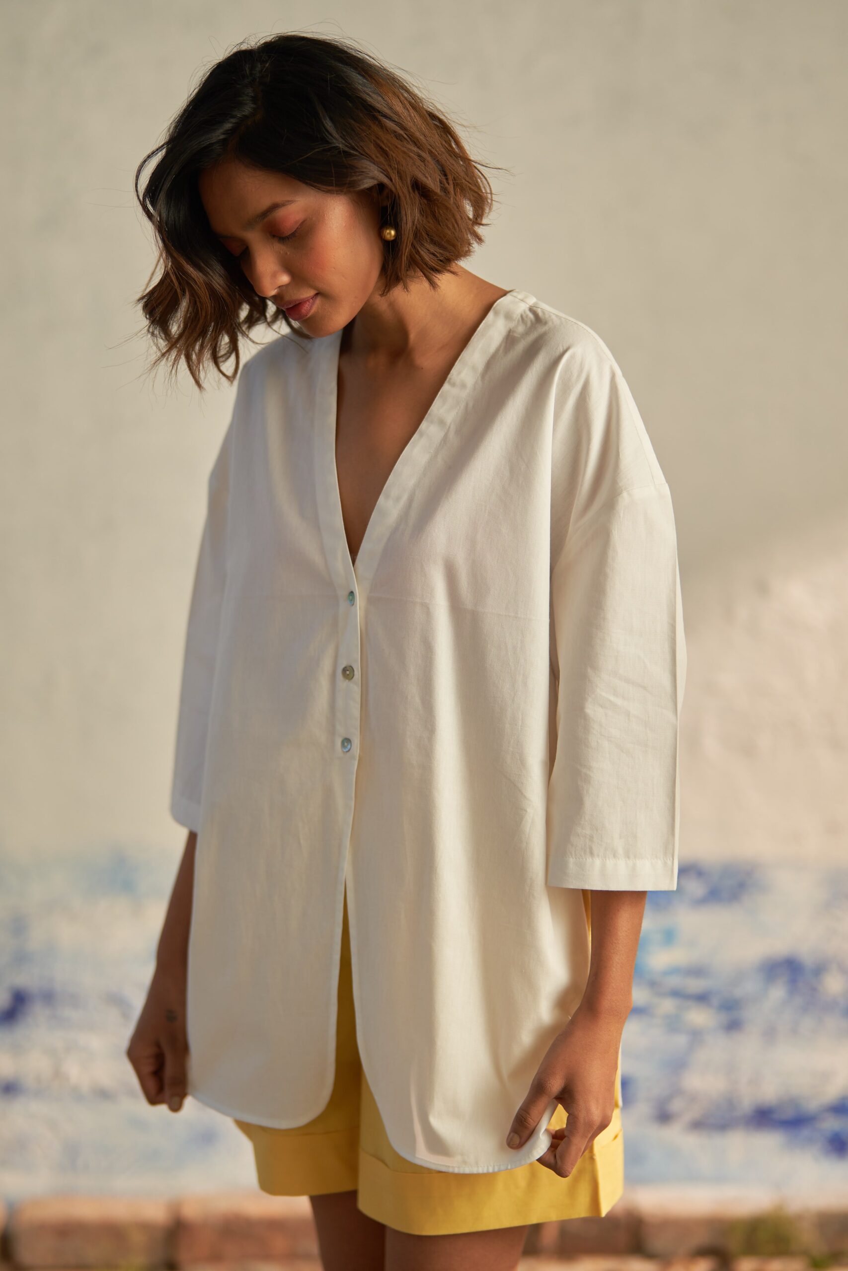 Taking inspiration from travelers who are constantly exploring, this silhouette offers a fresh interpretation of the classic tailored shirt. The plunging neckline, devoid of collars, seamlessly merges into a short placket and free-flowing panels. Crafted from premium cotton poplin fabric, this shirt features a modern oversized shape, allowing for easy layering over tees. Tonal buttons and slightly curved edges add the finishing touches.